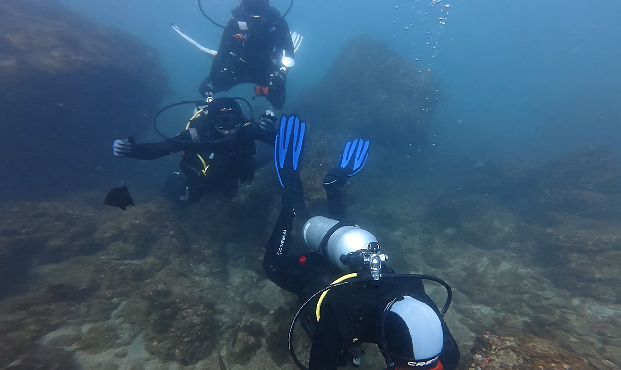 물속에서 그런 일이 발생하면 안 되지만 내 공기통의 공기가 고갈되면 버디(항상 둘이서 유영해야 한다)의 보조호흡기를 통하여 호흡을 할 수 있다. 물속에서 그 상황을 연출하여 내 호흡기를 빼버리고 버디의 보조호흡기를 물고 함께 천천히 상승하는 과정을 실습한다. 나침반을 이용하여 물속에서 직선으로 유영했다가 다시 제자리를 찾아오는 것도 한다. 5미터 정도의 바닷속에서 교육과정을 마치고 잠깐 유영을 했다. 예쁘게 생긴 까만 도미가 내 주변을 떠나지 않는다. 워낙 교육생 다이버들이 많은 바닷속(서귀포항 동부방파제)이라 물고기도 다이버들에 익숙하다.