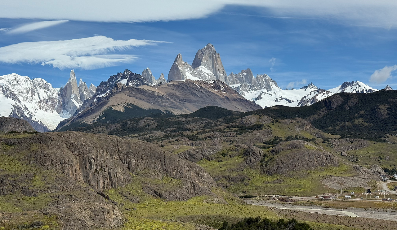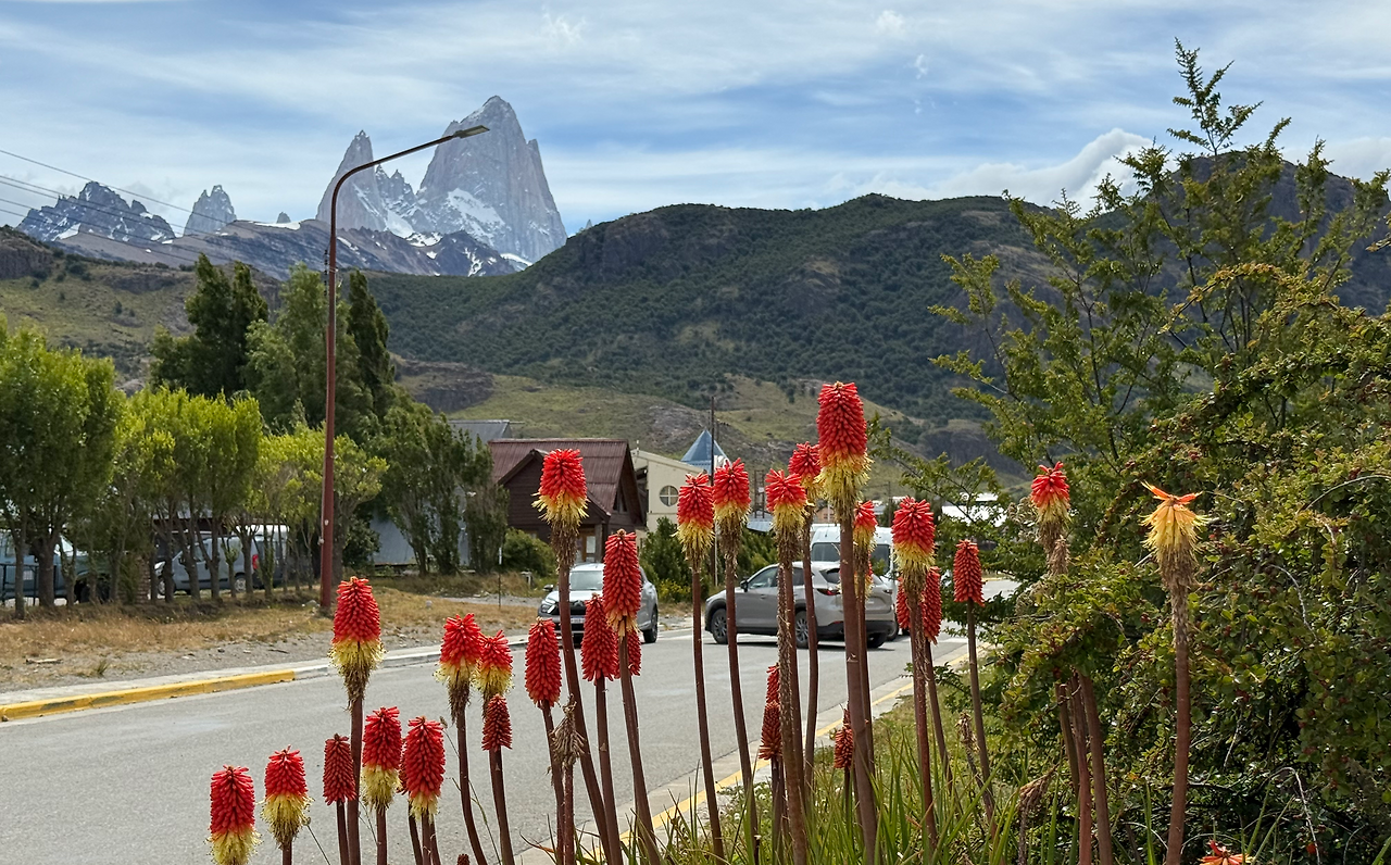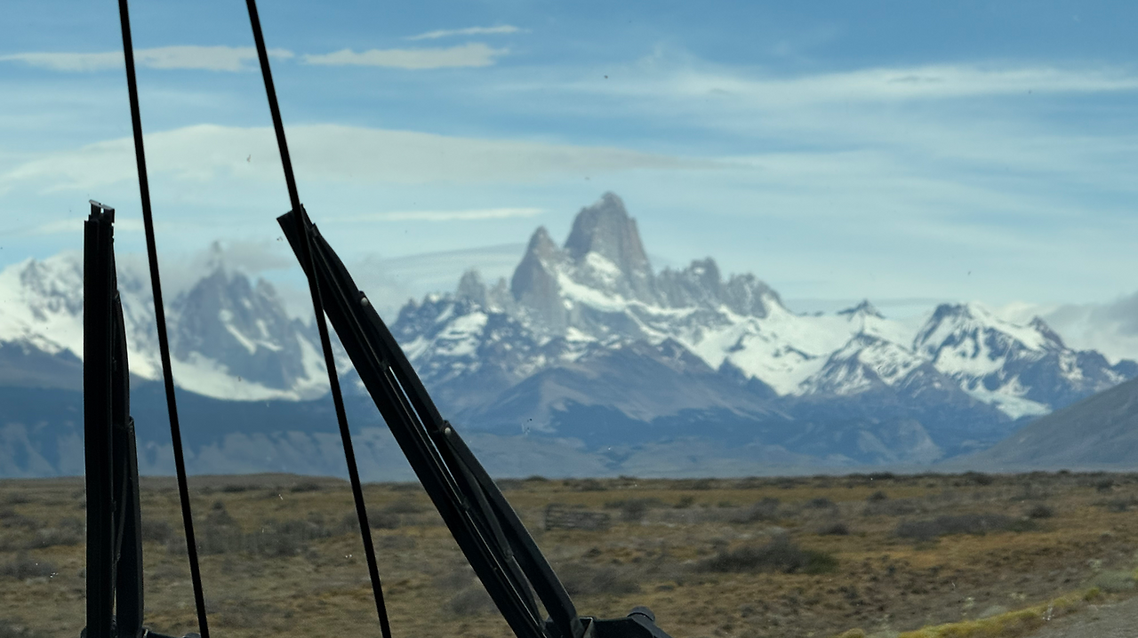 엘찰텐 60km 사인이 나온 뒤에는 피츠로이 연봉들이 아주 잘 보인다. 정말 잘 생겼다. 잘 생기고 볼 일이다. 한 번 보면 결코 그 모양을 잊을 수 없는 형상이다. 앞 유리창을 통하여 보고 있노라면 자연스럽게 심호흡이 이루어지며 가슴이 벅차오름을 난 느낀다. 오늘 투어는 성공적이다. 피츠로이가 해발 3405m라 구름이 낮게 드리우면 저 잘생긴 봉우리를 보지 못한다. 새벽 일출의 태양빛을 받아 황금빛으로 물드는 피츠로이봉을 '불타는 고구마'라고 한다. 엘찰텐에서 숙박을 하고 일출 시에 구름이 없어야 볼 수 있는 장면이다.