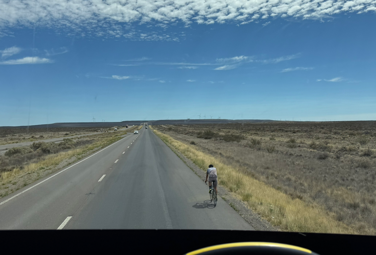 버스는 RN3에 올라타 시속 95km/h의 속도로 정속주행한다. 파타고니아 평원은 지리학적으로는 스텝(steppe) 지형이라고 한다. 풀은 자랄 수 있지만 나무는 자라기 어렵고, 비가 거의 오지 않아 대지는 바짝 말라 있다. 산도 없고, 강도 없다. 양쪽으로 지평선만 보인다. 이런 곳을 '경치가 없어서 경치가 되는 곳'이라고 한다. 아무것도 볼 것이 없어서 장엄한 경치???