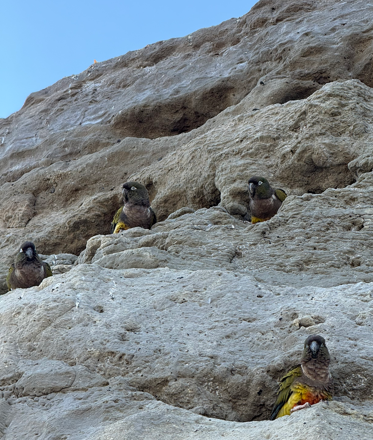 Las Grutas에서 새벽, 새소리에 잠을 깼다. 새들이 시끄럽게 해서 깼다기보다는 보통 6시간을 자고 나면 규칙적으로 깬다. 그때 새소리가 들렸다는 것이다. 이 동네 새들이 왜 이리 시끄럽냐고 AI에게 물었다. 파타고니아 앵무새란다. Grutas가 동굴을 의미한다. 바닷가 사암 절벽에 새들이 동굴을 파서 둥지를 만들고 산다. 색깔도 화려하고 크기도 까치만 한 앵무새들이다. 아침저녁으로 먹이 활동을 하면서 떼 지어 날아다닌다. 그리고 엄청 시끄럽다.