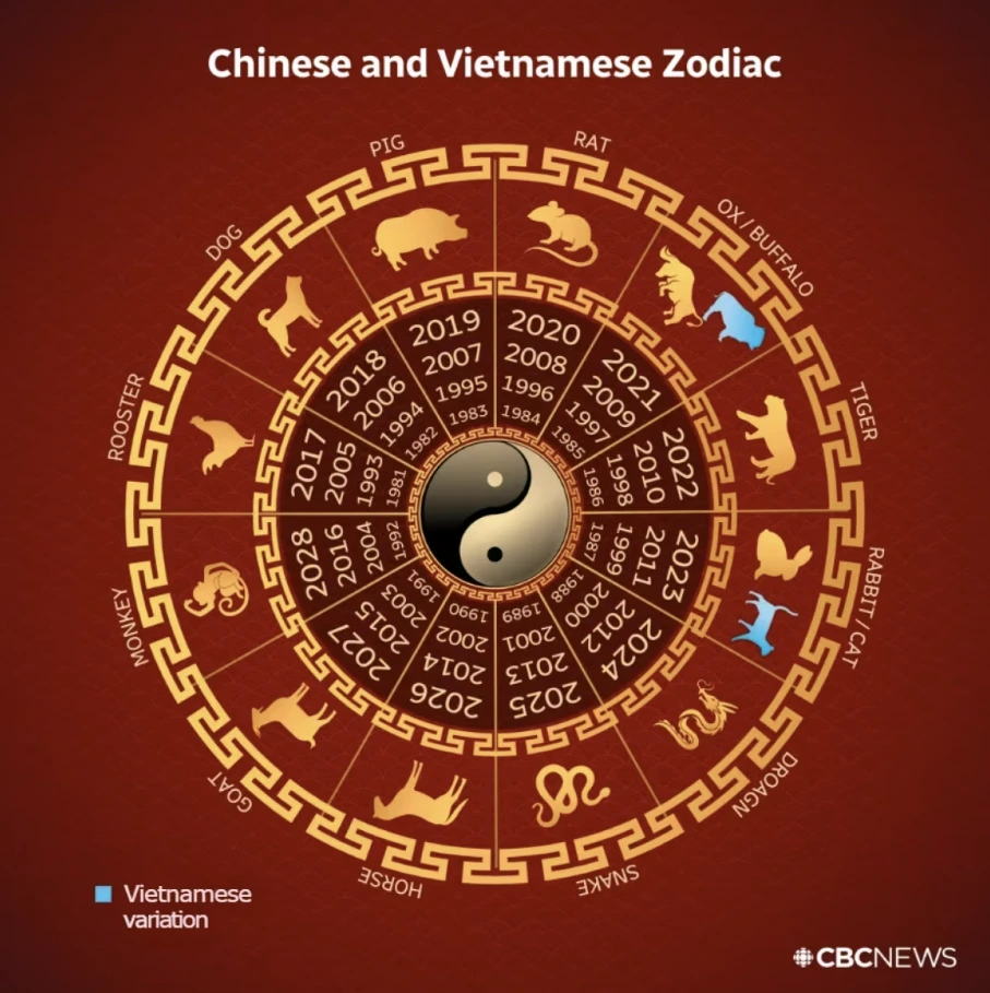 그게 뭔 소린고 하니, 중국과 베트남 모두 12간지를 따르지만, 12개의 동물이 모두 일치하는 것은 아니라고 했다. 아래의 표에서처럼 베트남에서는 소와 토끼 대신 물소와 고양이를 따르고 있었다.