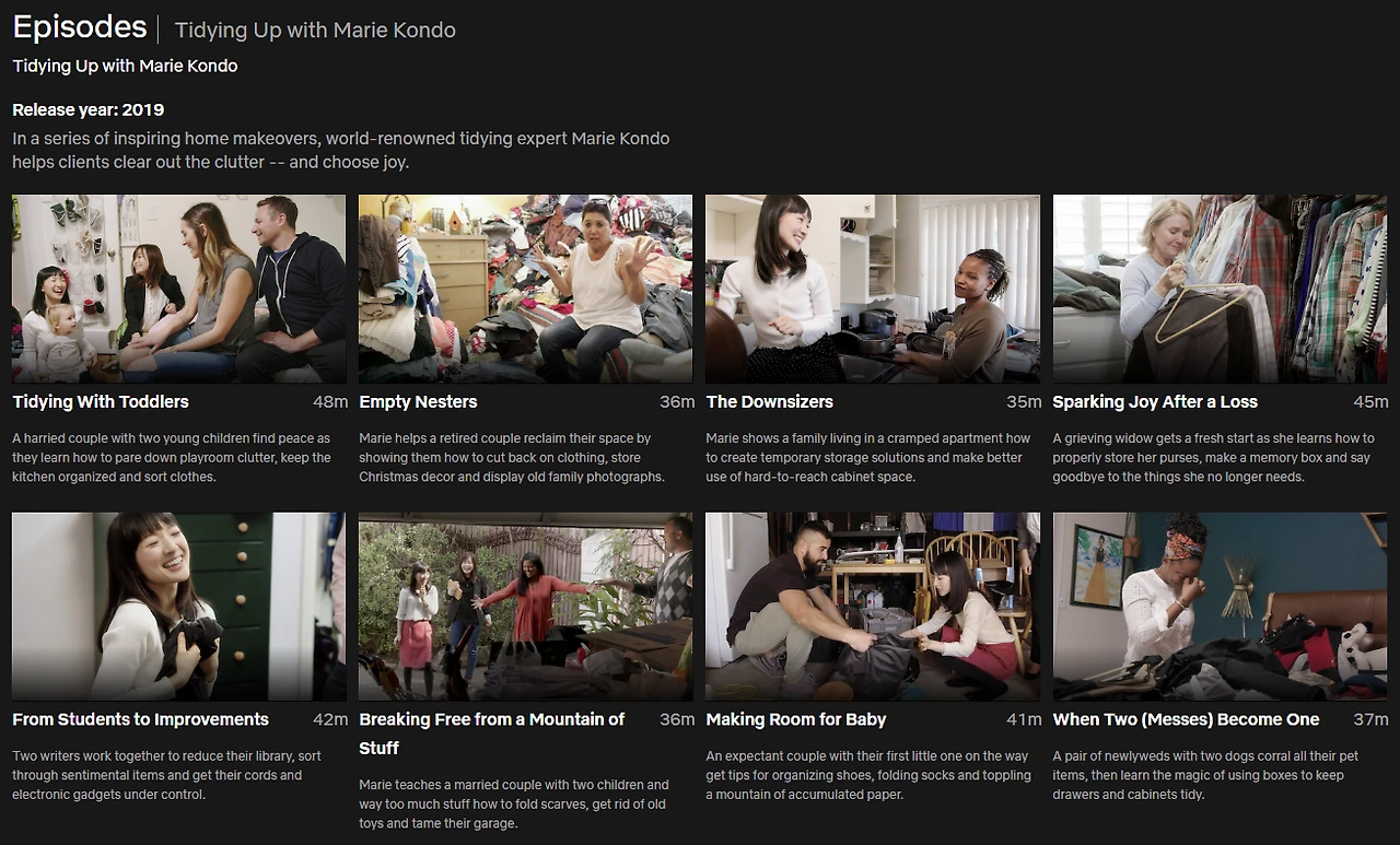 넷플릭스에서는 위와 같이 8개의 에피소드를 통해 ‘곤마리식 정리법’을 소개했고, 사람들은 그녀의 조언대로 “설렘 (spark joy)”이 느껴지지 않는 물건은 하나둘씩 버리는 것으로 이에 동참했다.