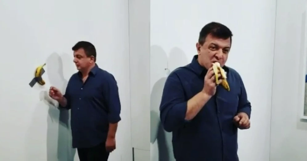 그러던 어느 날 '데이비드 다투나'라는 한 행위 예술가가 전시장 벽에 붙어 있던 바나나를 떼어먹는 일이 일어났다. 태연하게 그 모습을 촬영까지 한 그 남자는, 왜 그랬냐는 질문에 "배고파서 (hungry artist)" 먹었다고 대답했다.