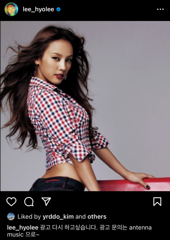 그랬던 그녀가 2023년 어느 날, 느닷없이 광고 복귀 의사를 밝혔다. 본인의 소셜 미디어 계정에 예전에 광고 모델을 했을 때의 사진을 한 장 올리고 그에 짧은 멘트 하나를 덧붙이는 방식으로.
