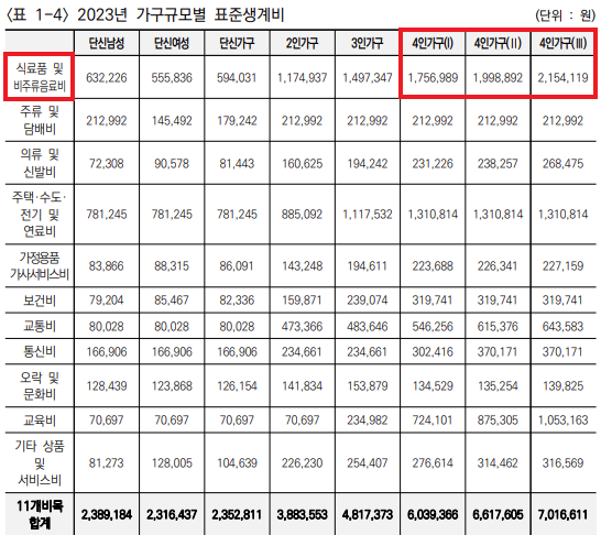 아래의 표에 따르면 4인가구의 식비는 아이들 연령에 따라 176만 원에서 215만 원 사이였다.
