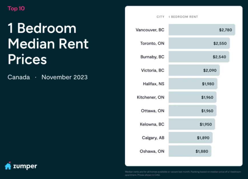 2023년 11월 기준, 캐나다 전체의 1 베드룸 월세 평균은 $1,900이었다. 하지만 밴쿠버와 토론토 등 일부 도시의 월세는 캐나다 전체의 평균값을 크게 웃돌았다.