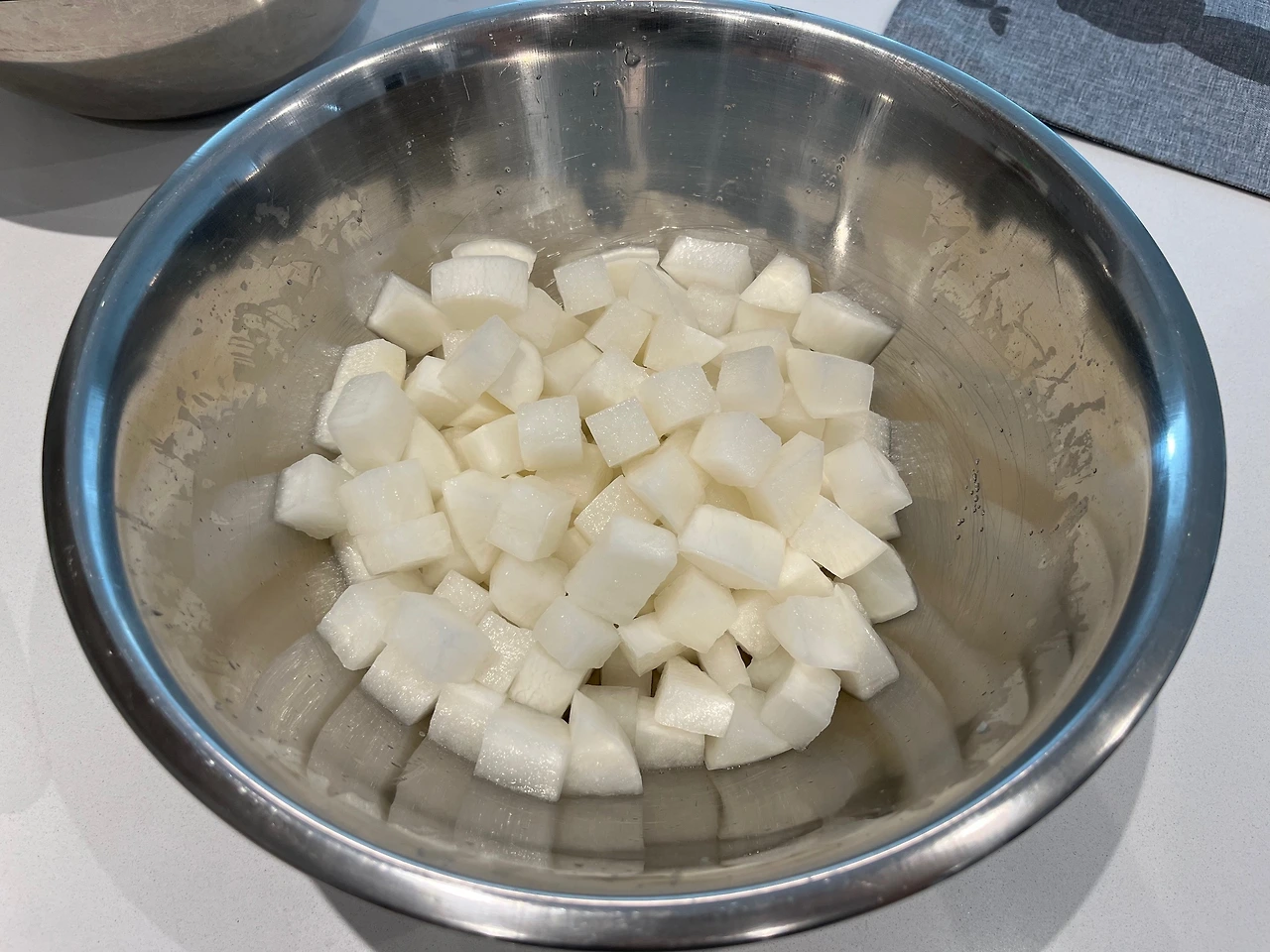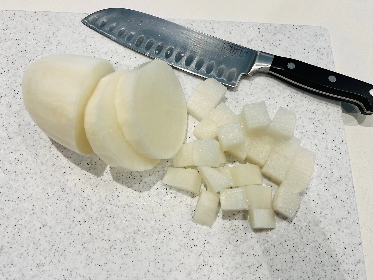 무를 씻고 껍질을 벗겨낸 후 깍둑썰기로 썰었다.