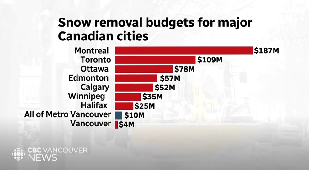 '캐나다 주요 도시별 제설작업 예산'을 보니 1위 몬트리올에는 연간 약 1천8백억 원의 예산이 배정된 데 비해, 밴쿠버 예산은 그의 2% 수준인 40억 원이네요. 빅토리아는 차트에 아예 나와 있지도 않고요.
