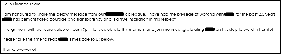 저는 지난 2.5년간 OOO와 함께 일할 수 있는 특권을 누렸습니다. OOO은 용기와 투명성을 보여주었으며, 이 점에서 진정한 영감을 주는 인물입니다.