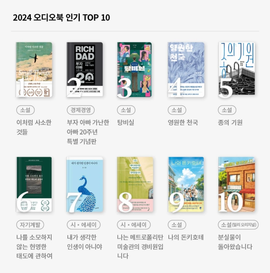 위의 Top10에 선정된 오디오북은 다 좋으니, 취향에 맞는 걸로 한 두권 들어 보셔도 좋을 것 같아요 :)