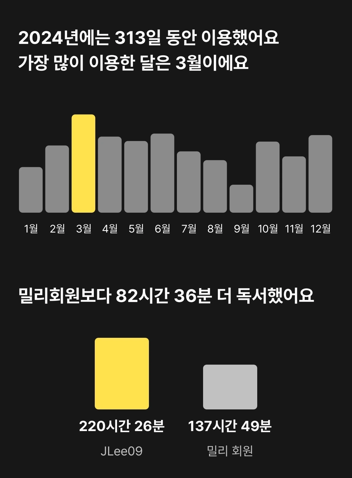 밀리 회원의 독서 시간 평균도 137시간이나 되네요!