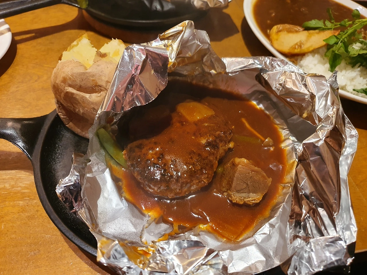 세트로 시키면 나오는 토마토 샐러드는 호불호가 갈릴만한 맛. 호일에 쌓여 나온 함박스테이크는 부드럽고 맛있었고, 크게 기대하지 않았던 오므라이스도 굿.