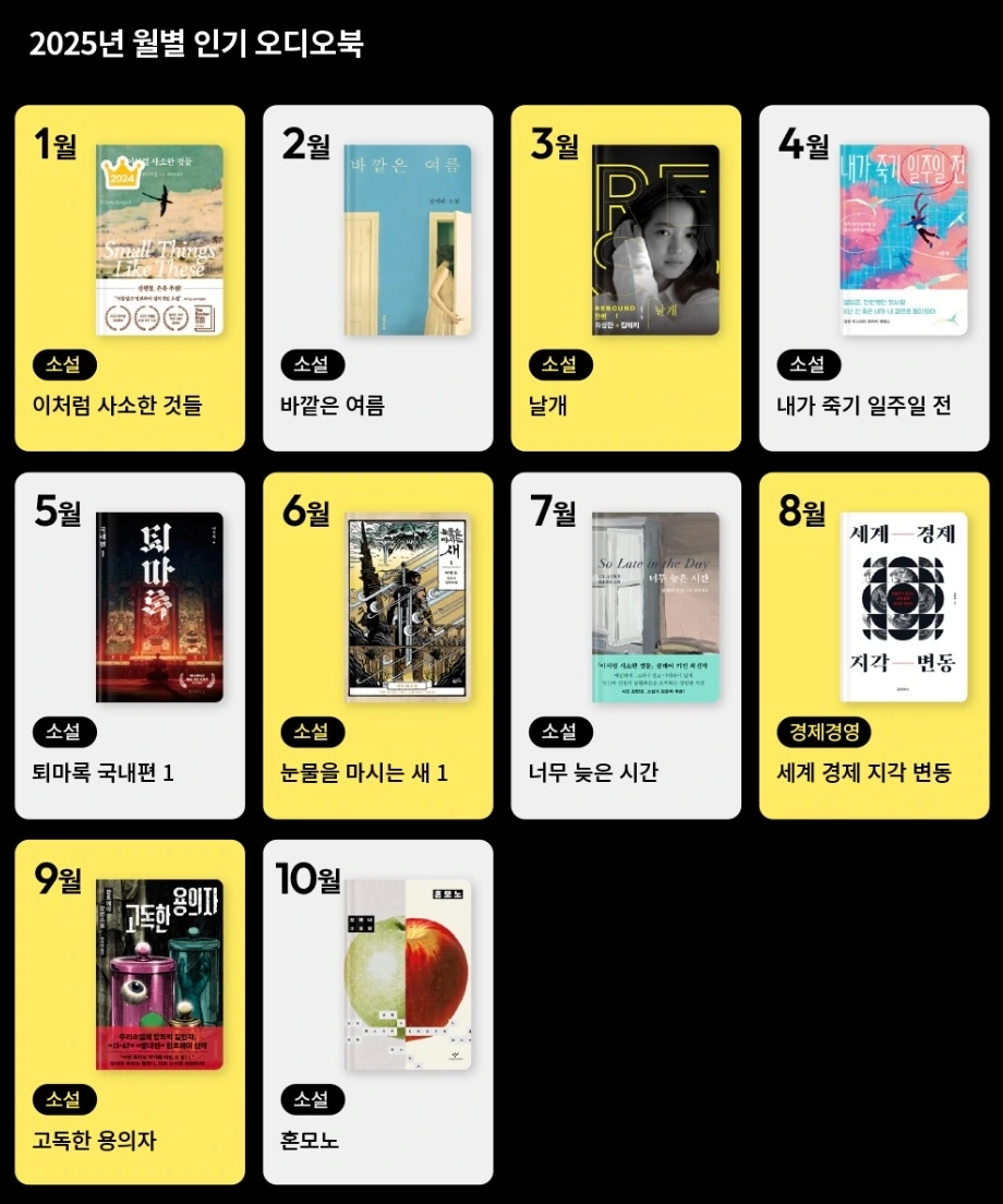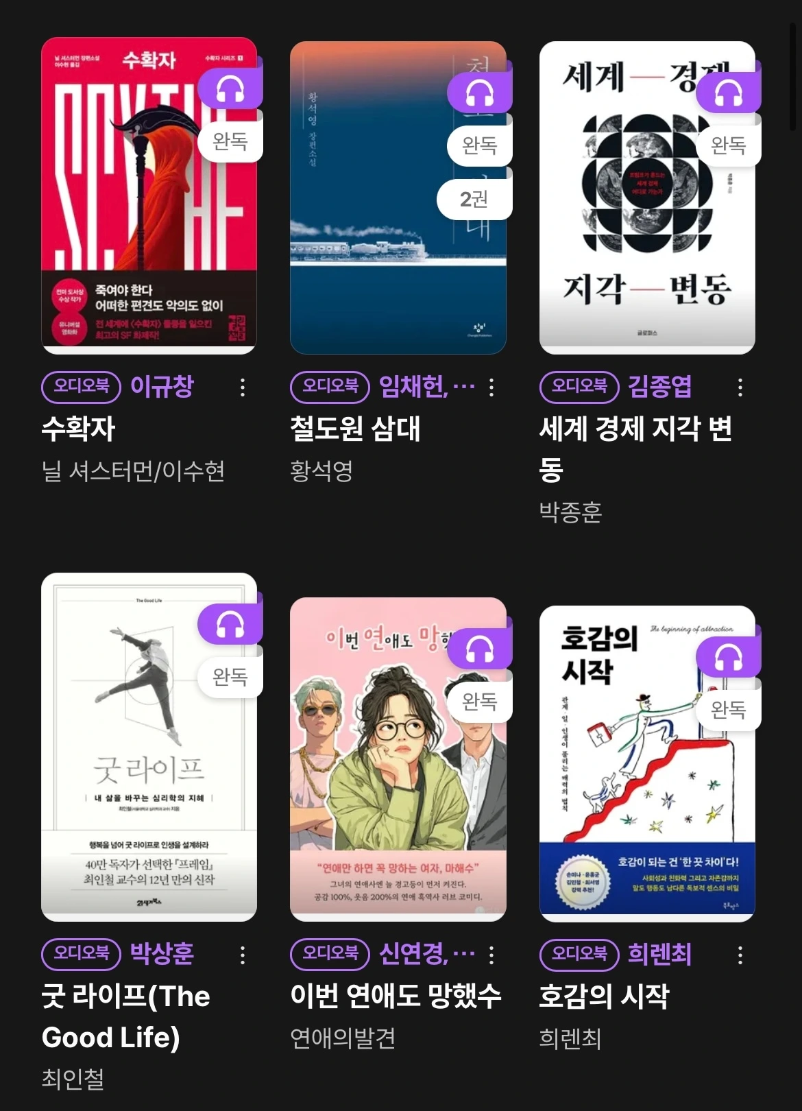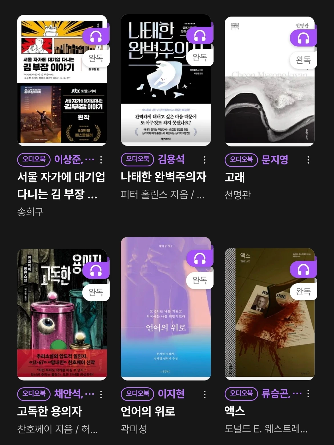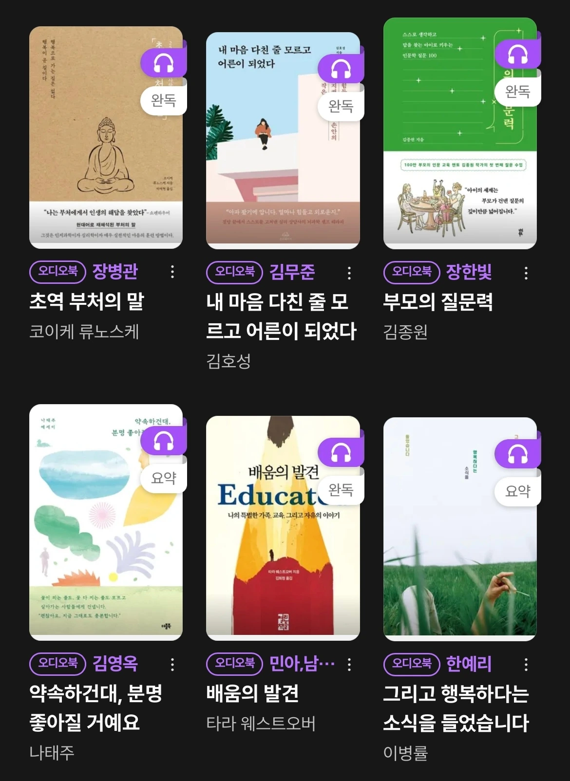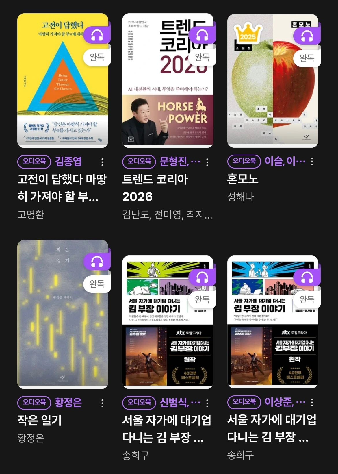 가끔 읽는 종이책을 빼면 거의 90% 이상은 오디오북으로만 책을 즐기고 있어요. 예전에는 청소나 운전 등 다른 일을 하면서 동시에 책을 들을 수 있다는 장점 때문에 오디오북을 선호했는데, 언젠가부터 오디오북 자체의 매력에 푹 빠져버렸습니다.