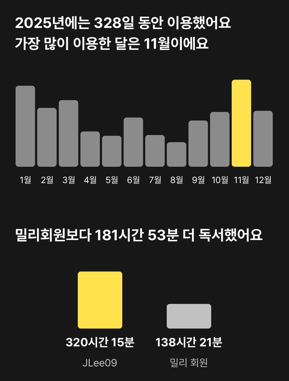 밀리 <통계>를 보니, 저는 올해 약 320시간 동안 밀리를 이용했네요. 하루 평균 53분, 작년 평균 41분에 비해 약 12분 늘었습니다. 제가 생각해도 올해 조금 더 책과 함께 한 시간이 길었던 것 같네요.
