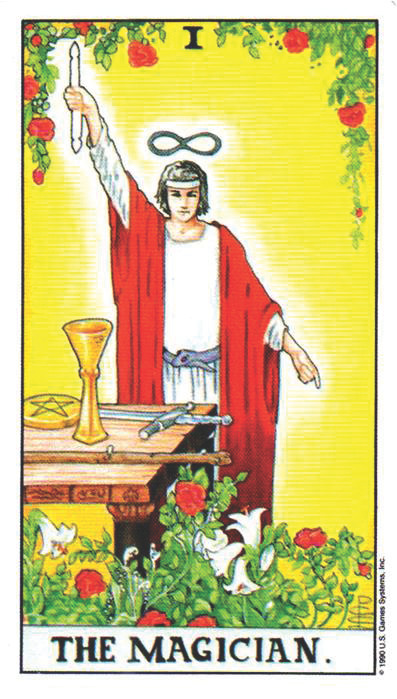 하늘을 향해 높이 치켜든 마술사의 지팡이는 우주에서 물질 세계로 신성한 지혜나 의지력을 전달하는 행위를 상징합니다.
