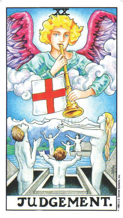 유니버셜 웨이트 타로의 '20번 심판(Judgment)' 카드는 깊은 영적 각성과 판단, 부활의 상징을 담고 있습니다. 이 카드의 상징적 요소들은 다음과 같이 해석됩니다:
