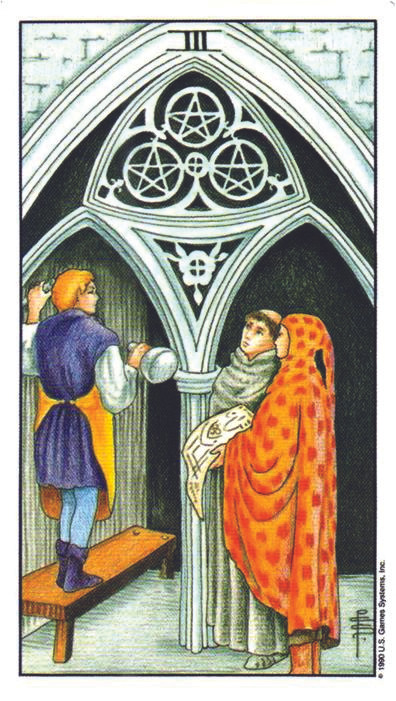 펜타클 3(Three of Pentacles)의 상징은 이렇다. 이는 협업과 팀워크, 그리고 각자의 전문성을 조화롭게 융합하는 과정을 나타낸다. 카드에 그려진 성당 건축 장면은 단순한 물리적 노동의 현장이 아니라, 공동의 목표를 향한 사람들의 조화로운 노력을 표현한다. 설계, 기술, 실행이라는 세 가지 요소가 긴밀히 연결될 때, 비로소 걸작이 탄생한다는 사실을 말해준다.