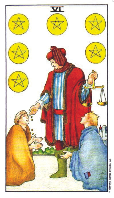 펜타클 6(Six of Pentacles)는 ‘공평한 나눔’과 ‘베풂’을 의미하는 카드다. 그림 속 부유한 이는 한 손에 저울을 들고, 다른 손으로 동전을 가난한 자들에게 건네고 있다. 이 저울은 단순한 물질적 균형을 넘어, 공정함과 정의의 상징이기도 하다. 누군가는 주고, 누군가는 받지만, 진정한 나눔은 단순한 시혜를 넘어, 사회적 균형을 이루는 과정이 된다.