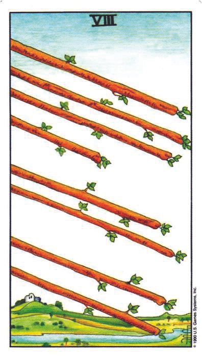 완드 8 카드는 라이더-웨이트 타로 덱의 전체 78장 중에서도 아주 특별하게, 사람이 전혀 등장하지 않는 카드예요. 대부분의 카드에는 주인공이 한 명 이상 나오는데, 이 카드에는 8개의 완드만이 하늘을 가르며 날아가고 있을 뿐이죠. 그래서 타로 리더들 사이에서는 ‘말보다 행동이 먼저다’ 혹은 ‘생각할 틈도 없이 진행되는 카드’로 자주 언급돼요. 실제로 이 카드가 리딩에 나오면, 일이나 감정이 순식간에 전개되는 상황을 암시하며, 연락이 빠르게 오거나, 갑작스러운 여행이나 만남이 성사되는 경우가 많아요.