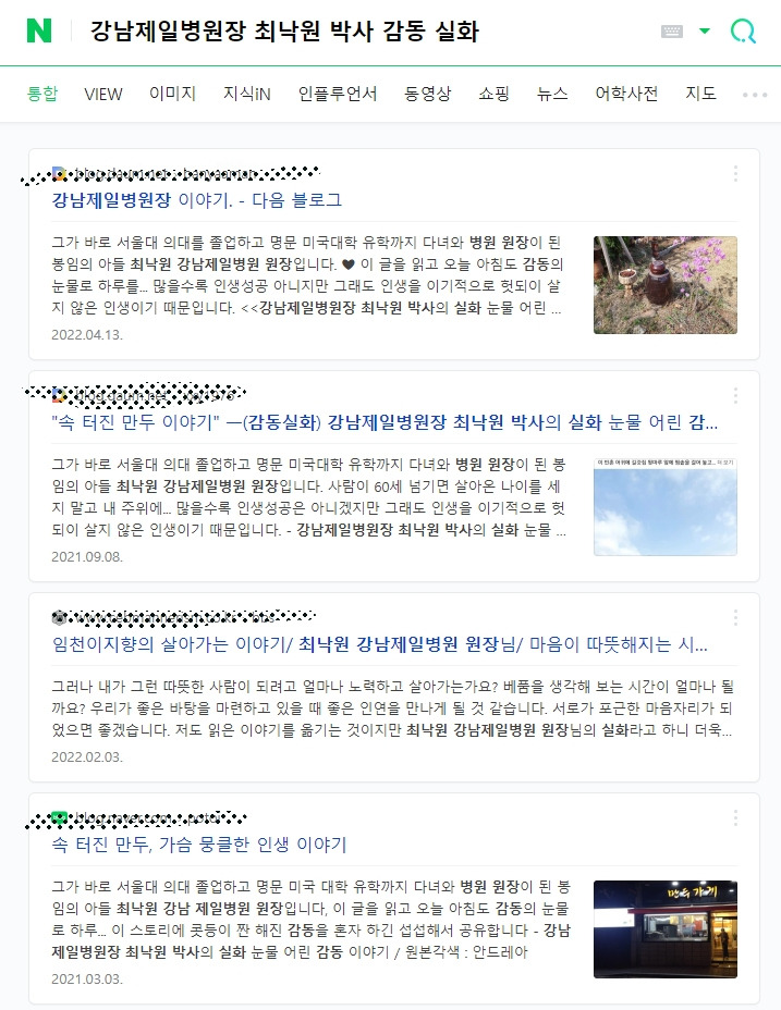 ‘강남제일병원장 최낙원 박사 감동 실화’는 누군가 최낙원 박사의 명의를 도용하여 지어낸 이야기라는 것이다. 심지어 어떤 블로그에는 ‘강남제일병원장 최낙원 박사 감동 실화’라는 글을 올리면서 최낙원 성북성심병원 이사장 사진을 함께 게재하고 있었다. 명찰에는 분명히 최낙원 원장 이름이 적혀 있었다. 최낙원 성북성심병원 이사장이 강남제일병원장으로 둔갑한 것이다. 이 얼마나 큰 결례인가. ‘강남제일병원장 최낙원박사 실화’를 검색하면 같은 글이 여러 블로그 등에도 올라와 있다. 카톡으로만 돌아다니는 글이 아니라는 이야기다.