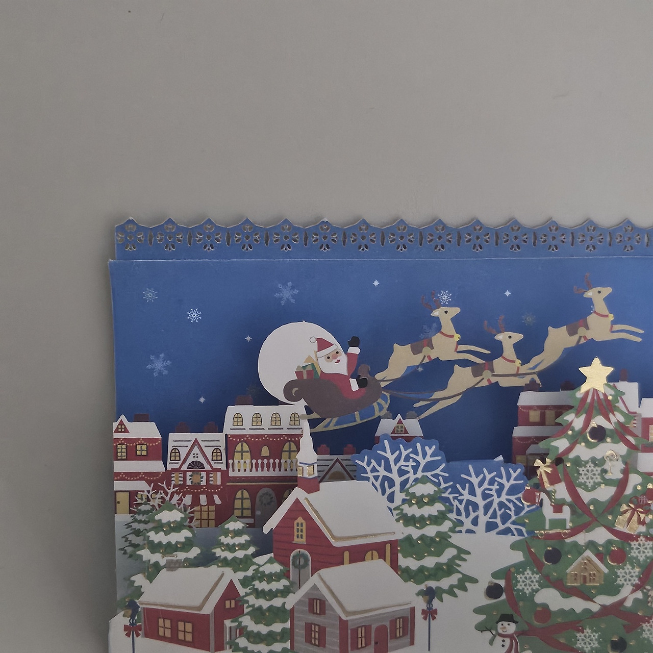 그렇게 종종 안부를 물으며 일 년에 한 번은 보는 사이가 되었다. 다시 겨울. 징글벨이 울리고, 알록달록 전구가 옛 기억 하나를 떠올리게 했다. 크리스마스를 앞두고 엽서를 골라 주고받았던 기쁨. 친구에게 편지를 써주고 싶은 마음에 앙증맞은 엽서 하나를 골랐다. 카드를 열어보자 입체 모양의 세계가 펼쳐졌다. 삼삼오오 모여 있는 집, 그 위로 하늘을 나는 산타와 루돌프. 물론 선물도 한가득 싣고.