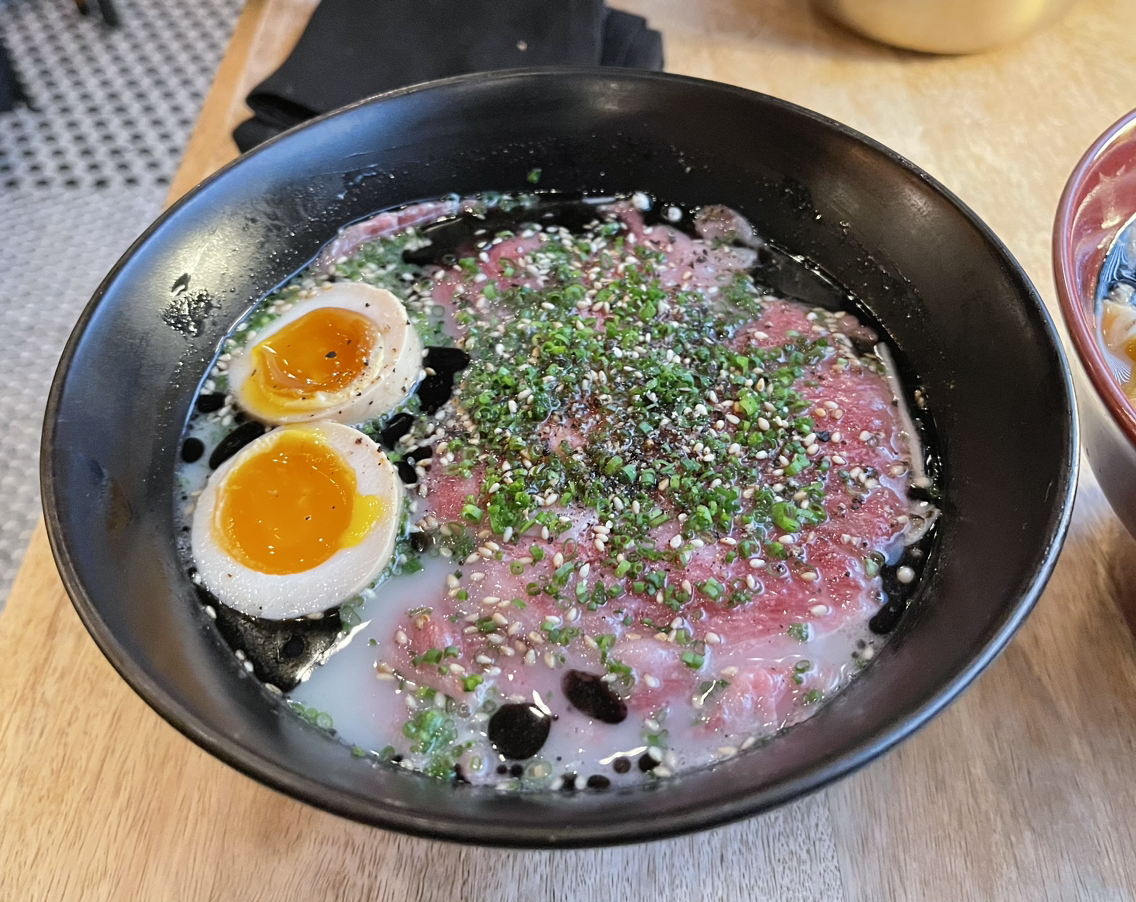 와규라면. A5 등급 와규가 들어갔다고 한다. 처음 보는 비주얼의 라면이었다. 국물을 한입 먹고 딱 든 생각은, ’ 이거 사리곰탕인데?‘. 면 자체가 사실 크게 인상 깊진 않았는데 꼬불꼬불한 게 확실히 라멘보다 라면에 조금 더 가깝다고 느껴졌다.