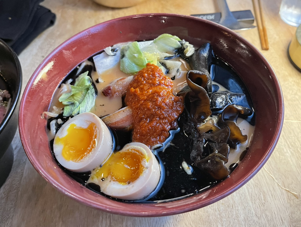 이제 메인. 고추라면이다. 고추장 베이스 국물 같았는데 꽤나 깊은 맛이 났다. 목이버섯부터 삼겹살까지 재료가 굉장히 풍부했다. 근데 반숙 계란 추가가 오천 원 실화? 이게 뉴욕의 물가인가…