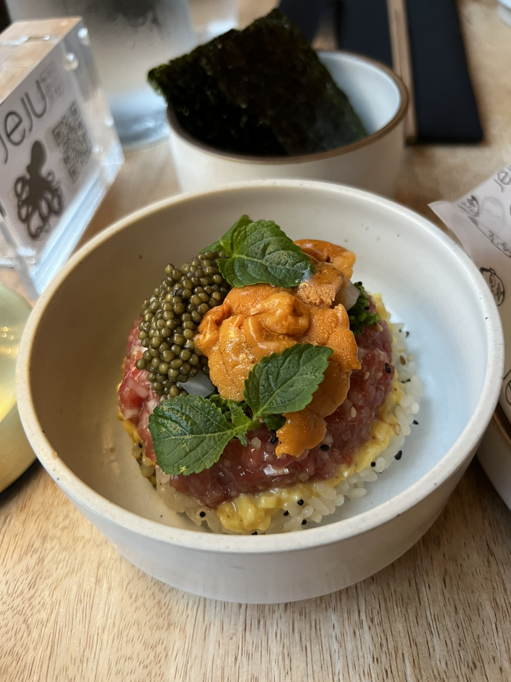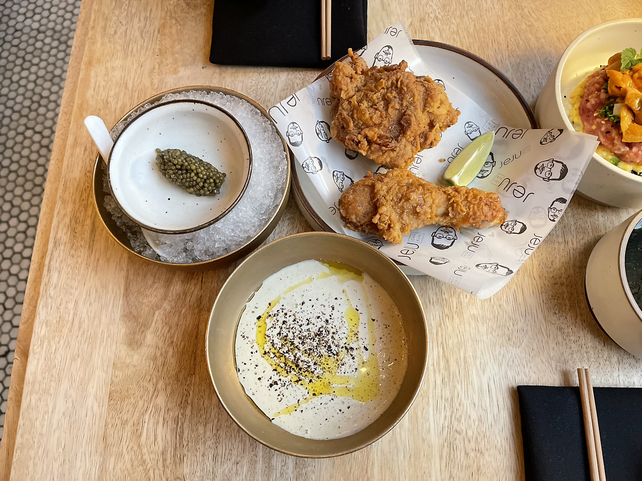 그래도 여기까지 와서 애피타이저를 지나치긴 아쉽고, 토로 쌈밥과 재주 프라이드치킨을 시켰다. 큼지막한 치킨 두 조각이 어니언 파우더가 들어간 소스, 캐비어와 함께 나오는데… 우선 바삭한 건 둘째치고 이 무슨 사치라는 생각에 먹으면서도 자꾸 실소가 터졌다. 나는 캐비어를 치킨과 먹게 될 줄은 상상도 해본 적이 없었다.