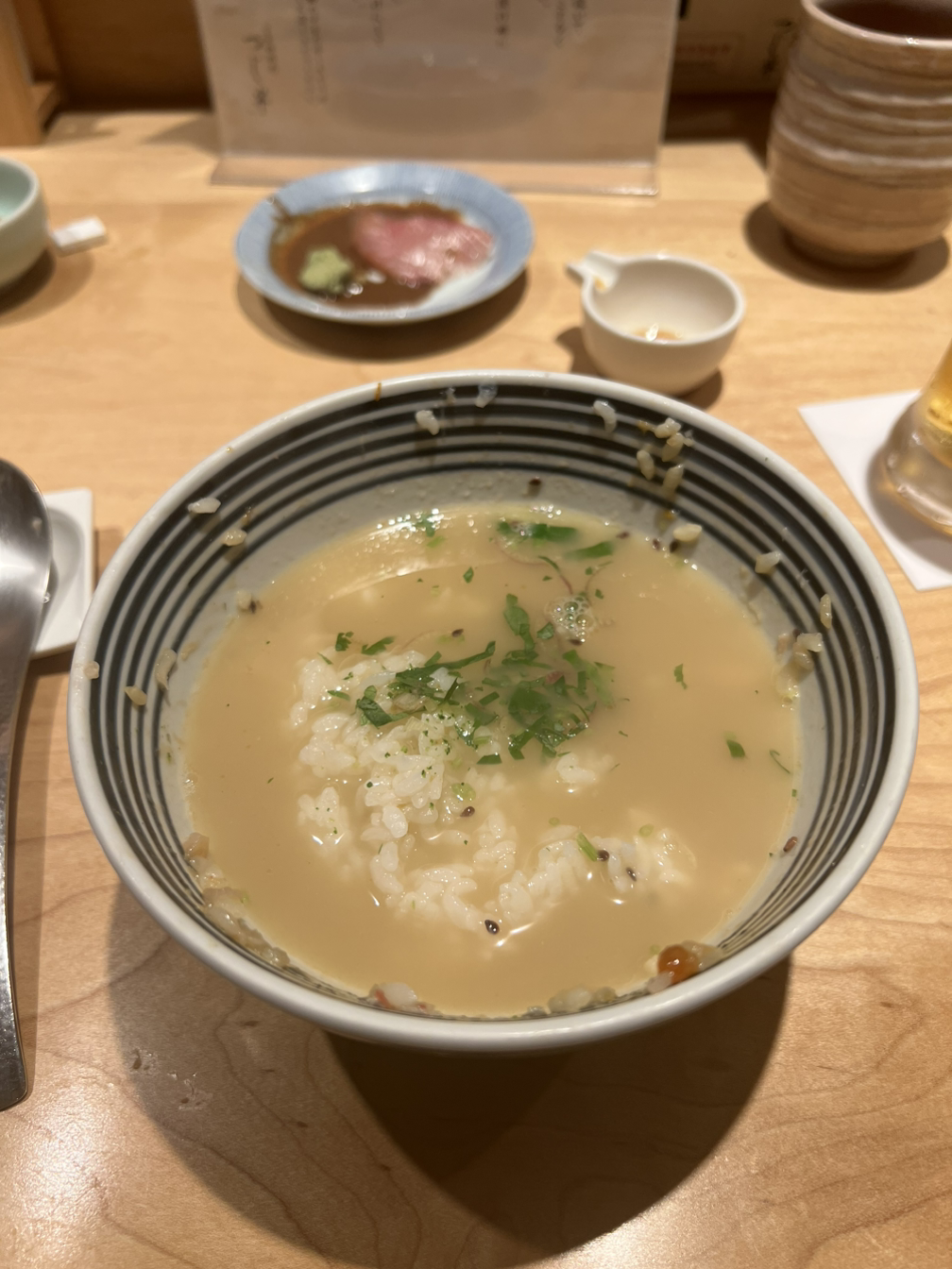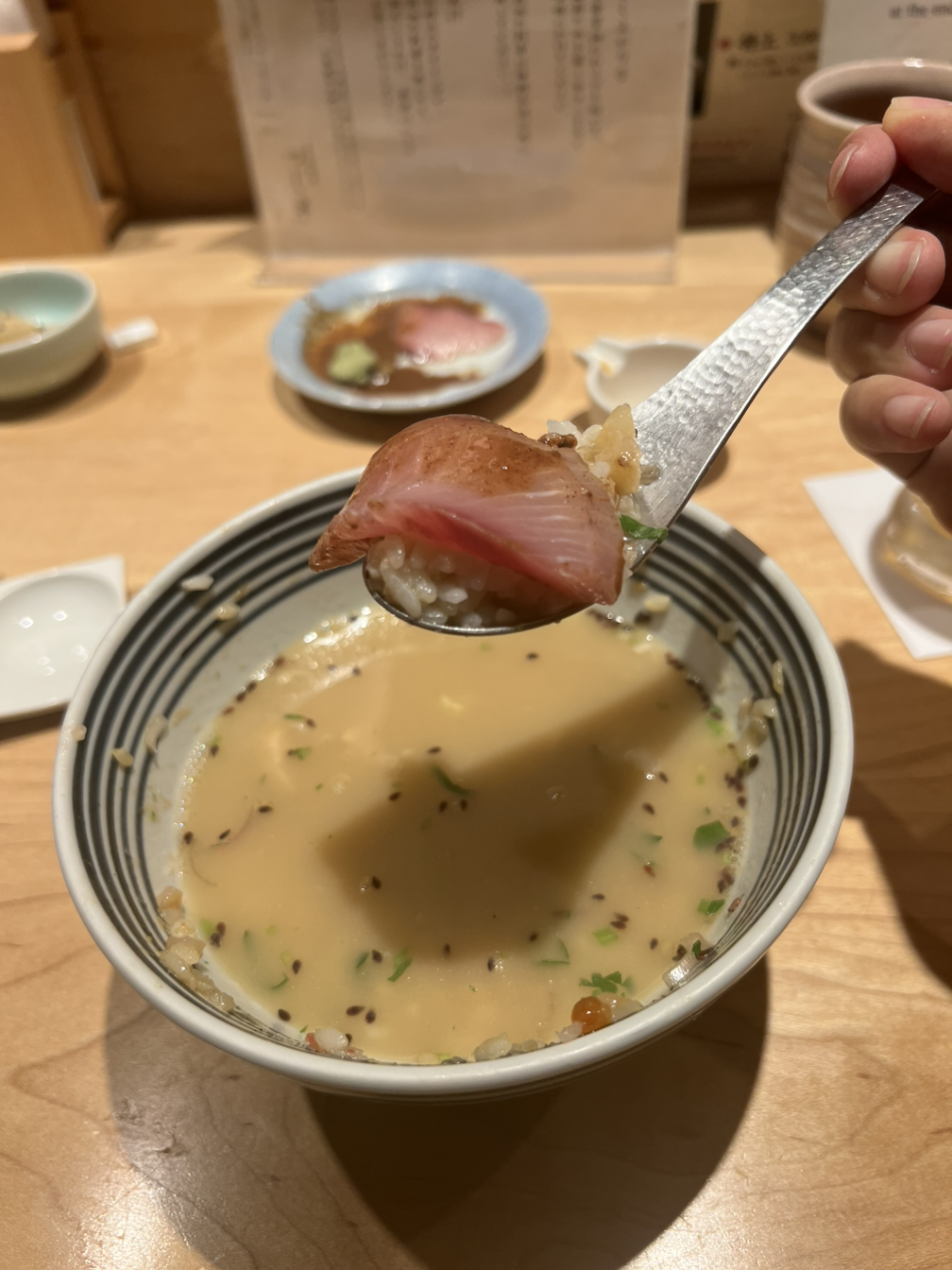 덮밥을 2/3 정도 먹었으면 이제 셰프님을 부른다. 그러면 내 그릇을 가져가 도미국물을 부어주신다. 이때 밥도 추가 가능하다. 뜨끈하고 담백한 국물. 이게 또 다른 별미다. 이 순간을 위해 남겨둔 사시미까지 올려먹으면 완벽한 마무리다.