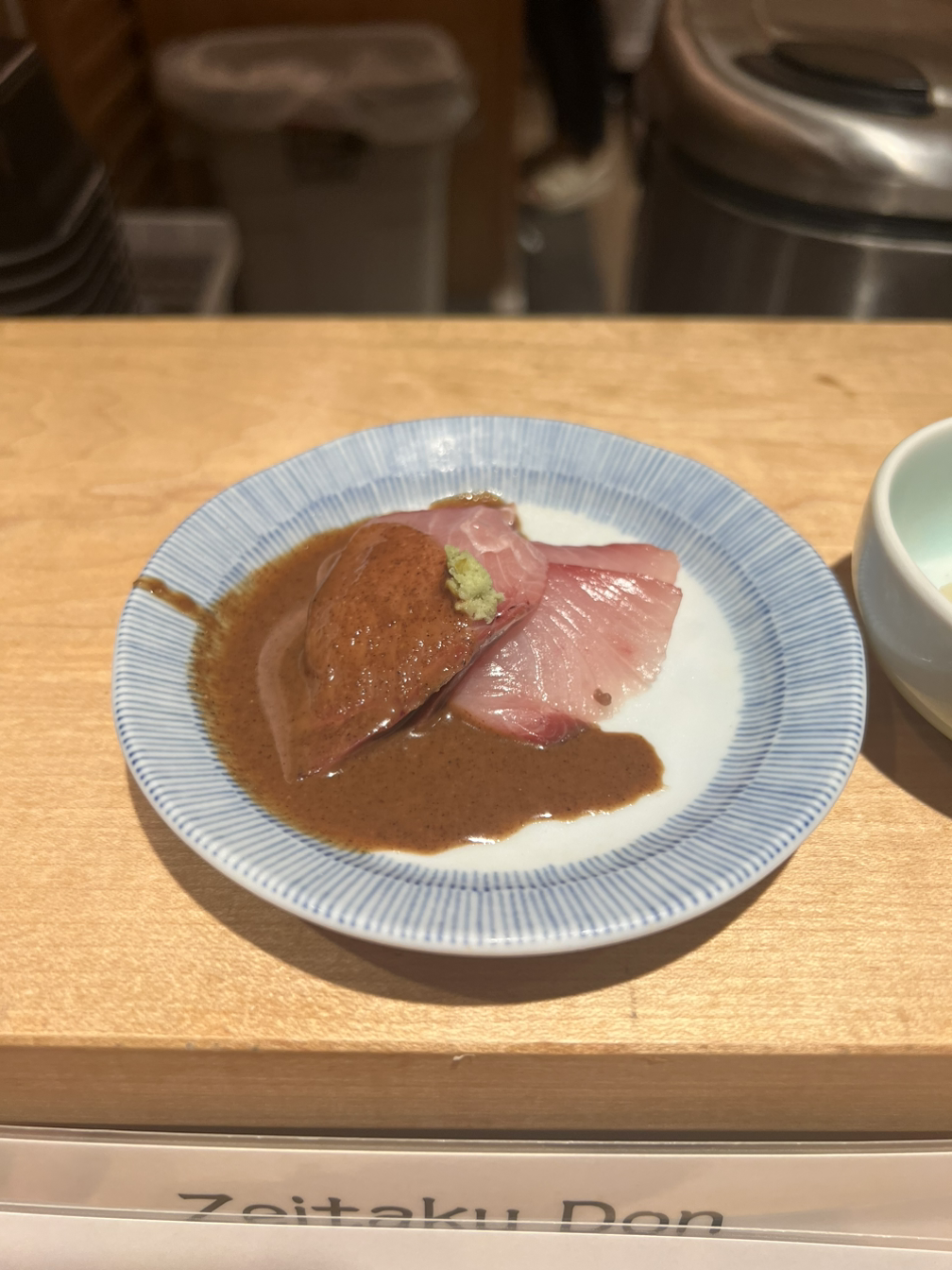 메뉴판 구경하는 사이에 바로 회가 나왔다. 도미회가 4점 정도 나오는데 땅콩소스 같은 게 위에 뿌려져 있었다. 카이센동이 나오기 전에 사시미가 나오니까 뭔가 더 기대되고 입맛이 돋워지는 기분이었다.