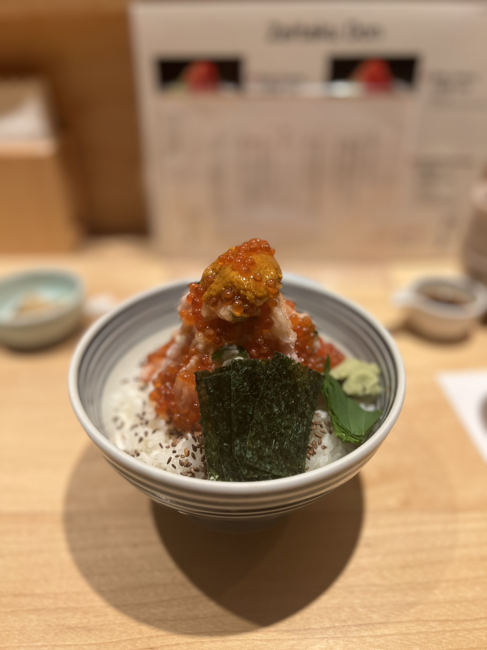 드디어 나타난 츠지한의 카이센동! 우니가 가장 위에 올라가 있고, 연어알이 고명처럼 해산물 산 위에 뿌려져 있는 이 카이센동의 자태는 영롱했다. 맛이 없으래야 없을 수 없는 비주얼이었다.