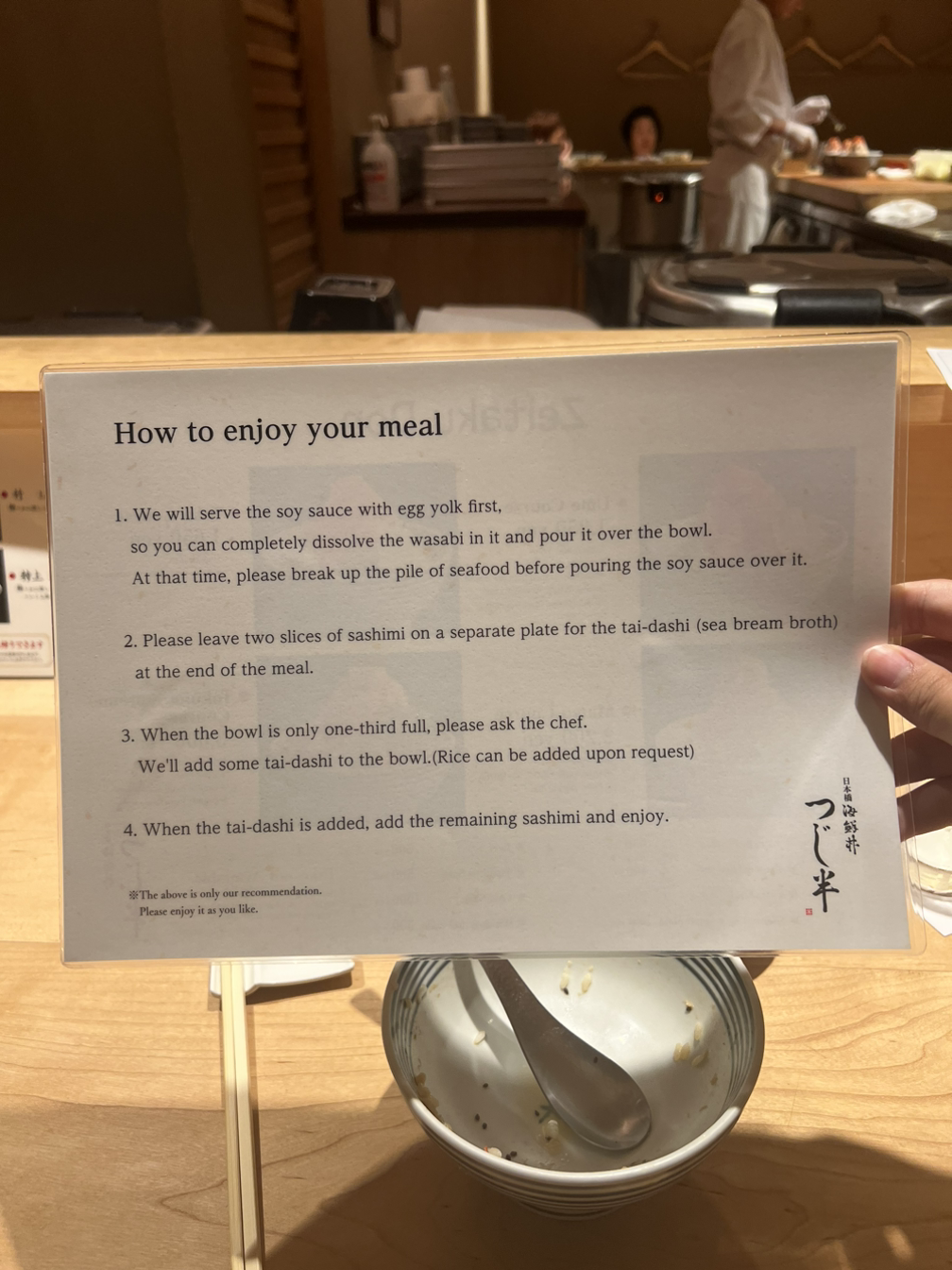 우선 메뉴판. 나는 우니가 포함된 2200엔의 Matsu 코스와 생맥주 한잔을 주문했다. 메뉴판을 뒤로 돌리면 식사를 즐기는 방법이 적혀있는데 요약하자면,