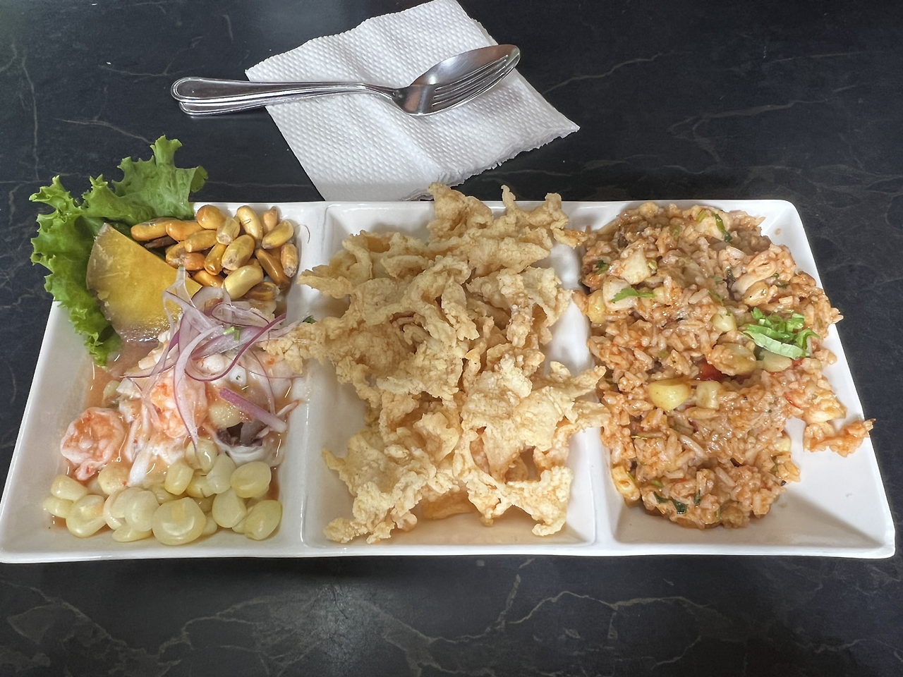 페루에서의 첫 끼로 내가 선택한 식당은 ‘Al Toke Pez’라는 곳이었다. 이곳은 넷플릭스에서도 소개가 되었다고 하는데 25 솔(약 8500원)이라는 합리적인 가격으로 페루의 음식인 ‘세비체', ‘치차론', 그리고 해물 볶음밥까지 맛볼 수 있었다. 20분 정도 걸어 식당 앞에 도착하니 대기 줄이 있었다. 내부는 좌석이 얼마 없고 다소 허름했다. 세비체는 페루의 대표적인 요리로 쉽게 말해 회를 무쳐서 만든 샐러드이다. 치차론은 원래 돼지나 닭을 튀긴 걸로 알고 있었는데 이 식당에서는 오징어 튀김이 나왔다. 세비체는 고수의 향이 났고, 치차론은 먹어본 맛의 고소한 튀김 맛이었다. 볶음밥도 맛있었다. 부담 없이 페루스러운 한 끼를 먹을 수 있어서 굉장히 만족스러웠다.