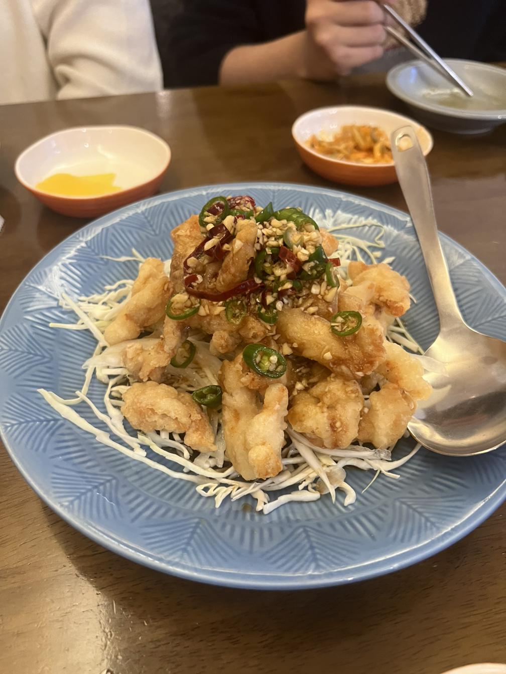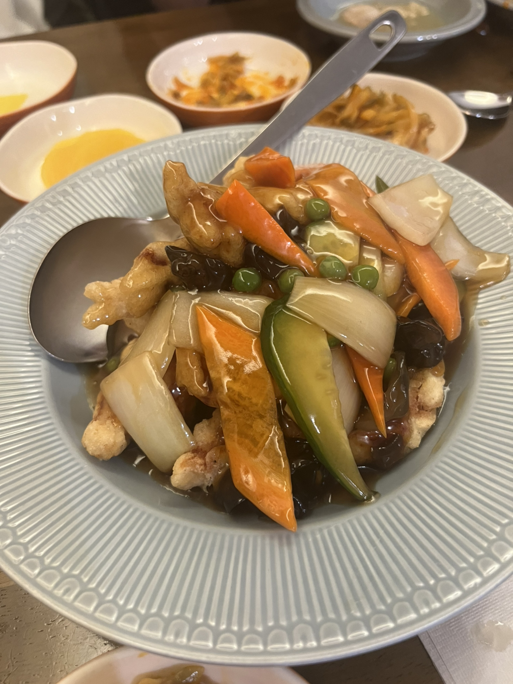 여기까지 왔는데 중국집에서 탕수육 맛은 한번 봐야 하지 않겠냐며 추가로 주문한 탕수육이 나왔다. 소스는 부먹으로 나오는데도 바삭함이 살아있었다. 새콤달콤한 소스 맛이 내 취향이었다. 생각해 보니 우리 동네단골 중국집 탕수육과 맛이 비슷했던 것 같다.