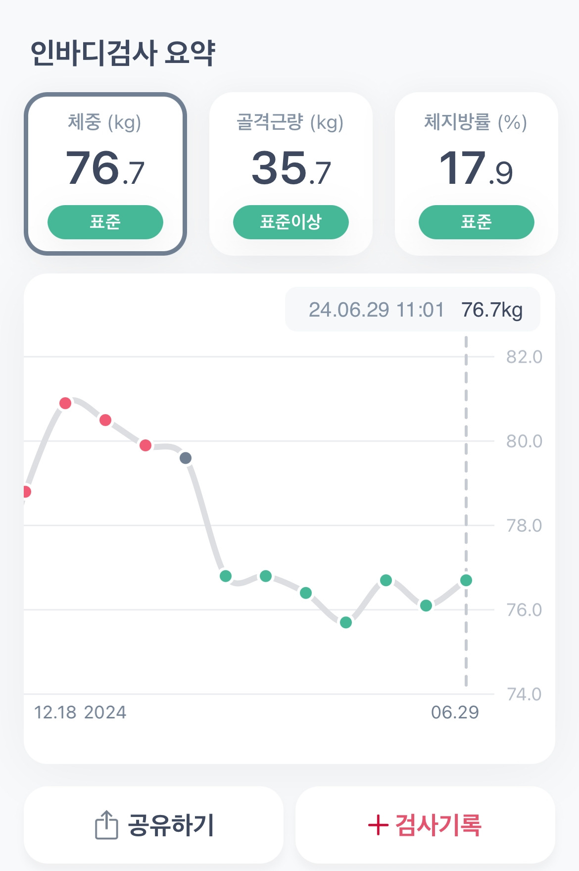 체지방률이 드디어 17% 대에 진입했다. 휴가 나갔다 오면 다시 원상 복귀될 가능성이 높지만 그래도 기쁘다.