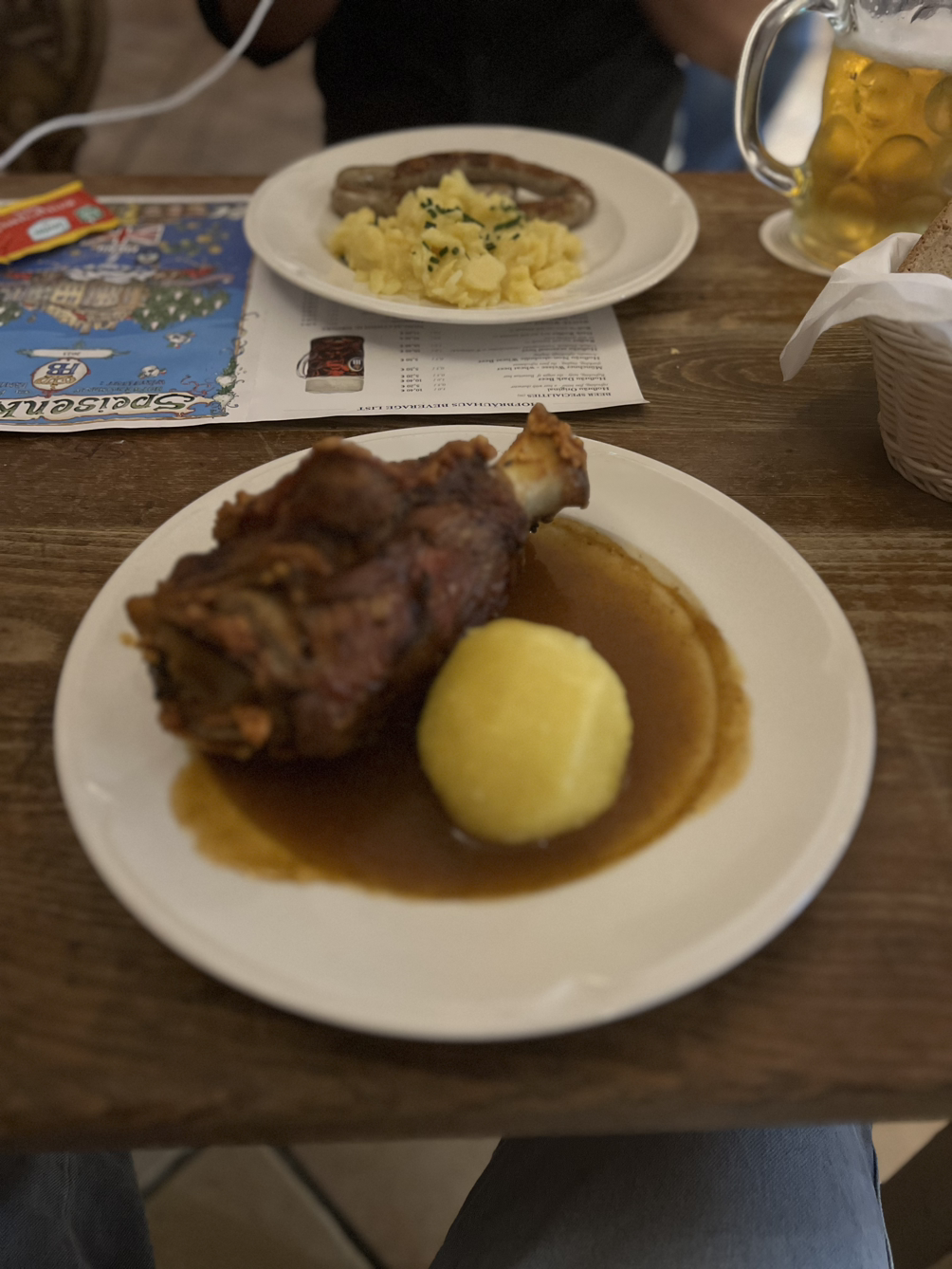 곧 슈바인학센이 나왔다. 독일식 족발로 유명한 음식이지만 돼지의 발 끝부분을 사용하지 않는다는 점에서 차이가 있다. 겉은 바삭하고 속은 촉촉한 ‘겉바속촉’ 그 자체였는데, 그래서 그런지 맥주와 너무 잘 어울렀다. 바닥엔 짭짤한 그레이비소스가 깔려있고 곁들여먹기 좋은 감자가 함께 나온다.