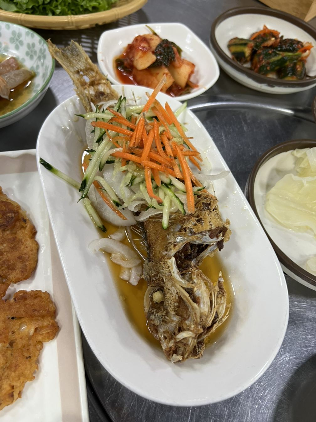 옥돔튀김은 처음 먹어보는 음식이었는데 가장 기억에 남았다. 바삭한 식감이 살짝 달큰한 양념과 잘 어우러져 굉장히 만족스러웠다. 딱새우장과 전까지 나오는 밑반찬 구성도 너무 알찼다.
