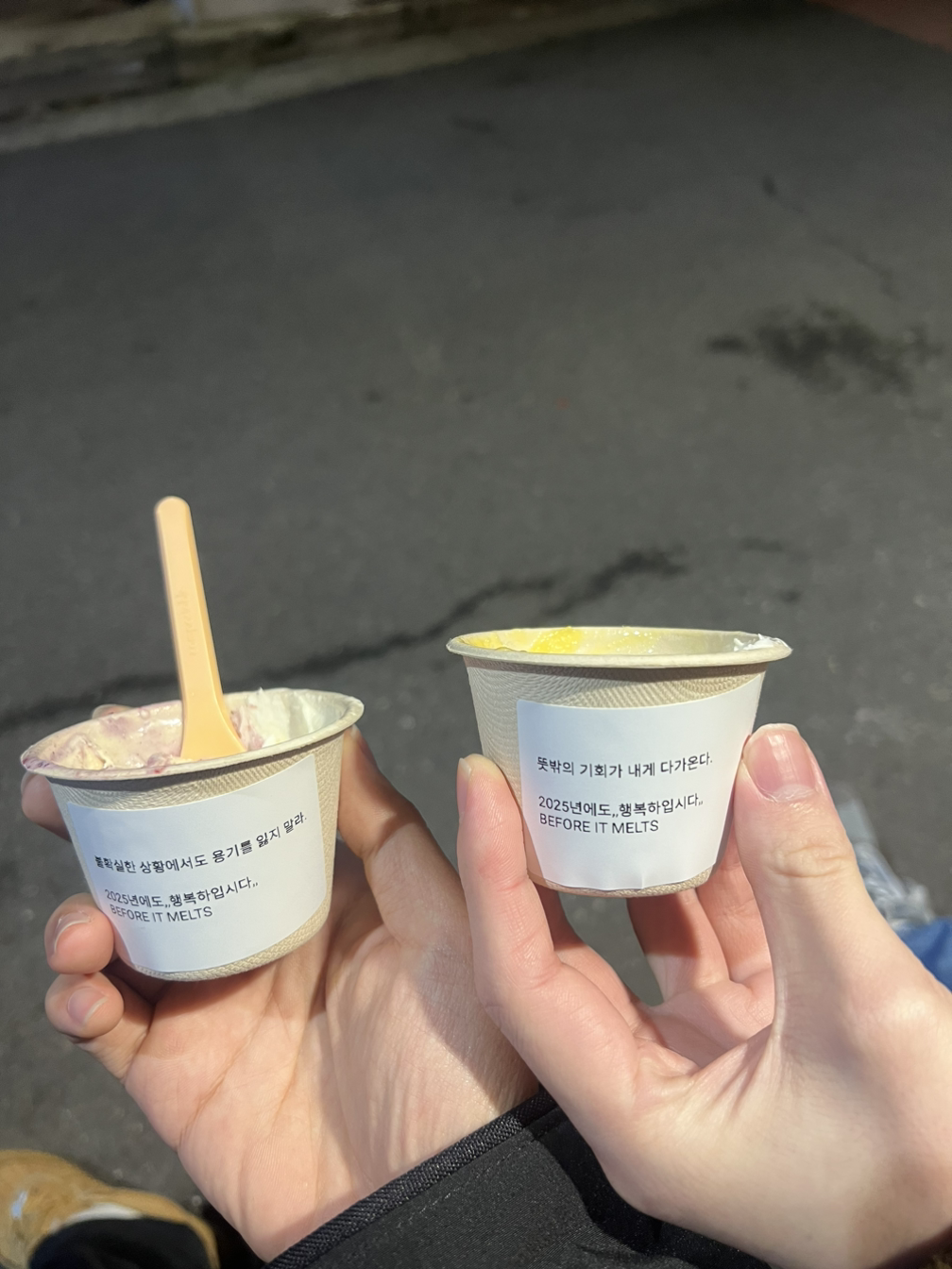 나한테 필요한 말이었다. 아이스크림한테 감동을 받을 줄이야. 그건 그렇고 여기 아이스크림 너무 맛있었다. 밤 10시, 우리는 영하의 온도에 밖에 서서 아이스크림을 먹었다. 아이스크림은 추울 때 먹어야 더 맛있다.