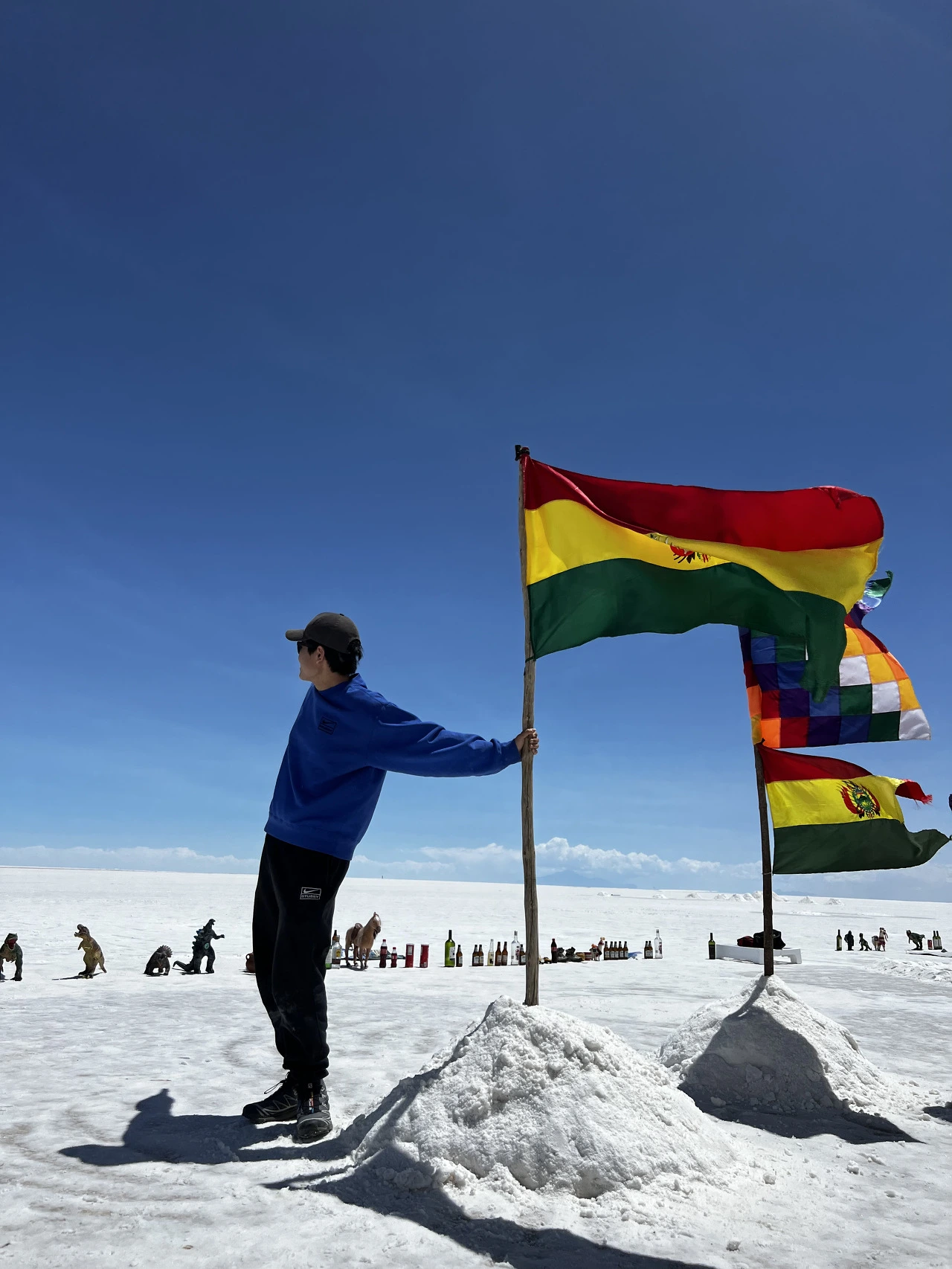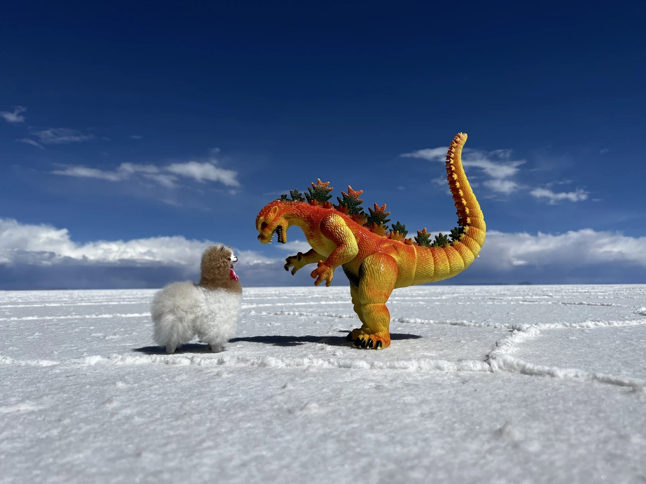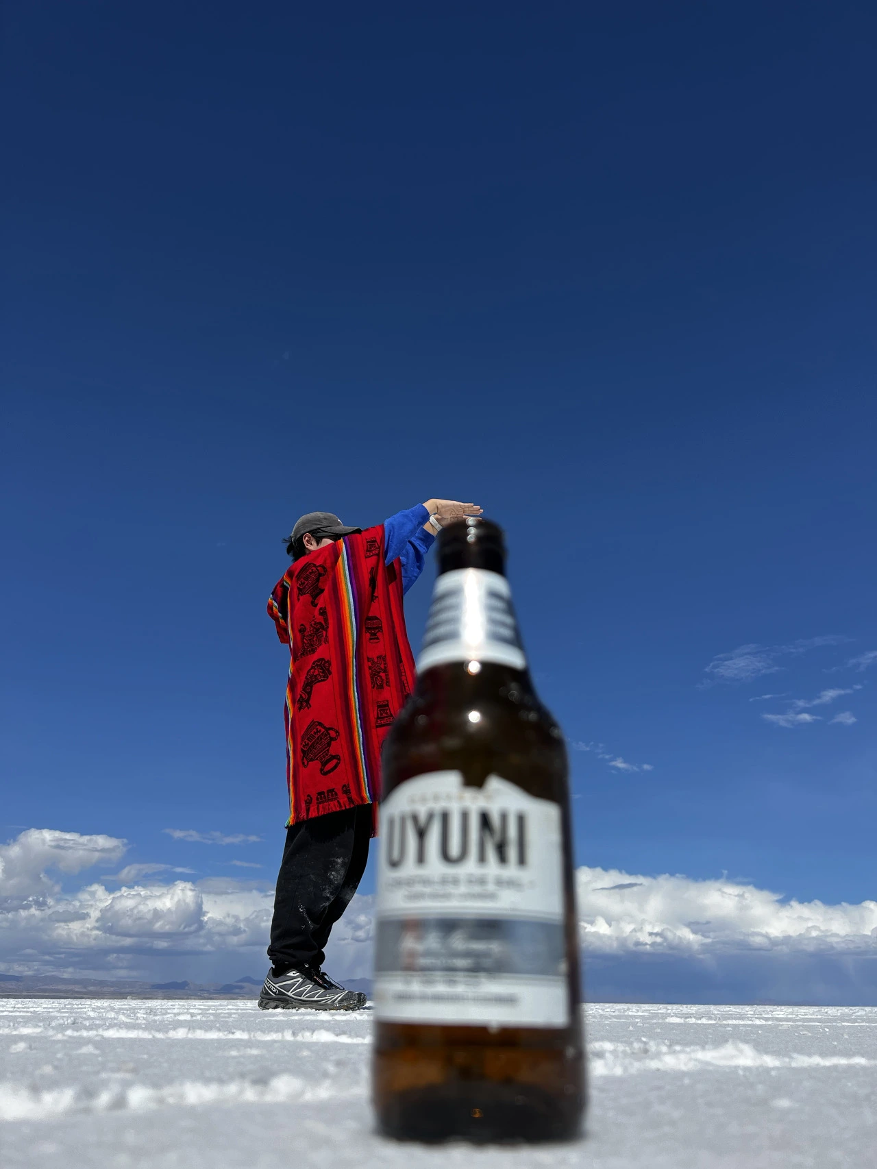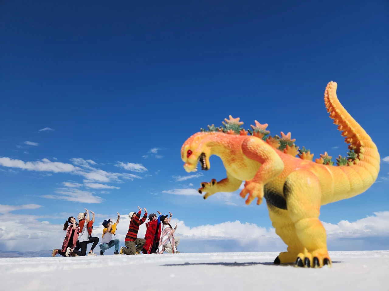 기차무덤에서 사진을 찍은 뒤 본격적으로 소금 사막에 들어가기 전 가이드는 우리를 시장 비슷한 곳으로 데리고 갔다. 길거리의 상점에서는 쭉 우유니와 관련된 다양한 기념품들을 판매하고 있었다. 나는 여행지마다 꼭 기념품을 수집하는 편은 아닌데, 우유니가 나에게 굉장히 의미 있는 목적지임을 알았기에 마음에 드는 자석을 하나 구매했다. 이제는 익숙해진 가격 흥정을 잊지 않았다. 그러고 나서 다시 차량에 탑승했고 슬슬 소금이 보이기 시작하는 곳에 다가갔다. 가이드는 군데군데 관광객을 위해 만들어진 포토 스팟에서 차를 멈췄다. 그리고 우리는 그럴 때마다 열정적으로 포즈를 취하며 관광객으로서의 본분을 다했다.