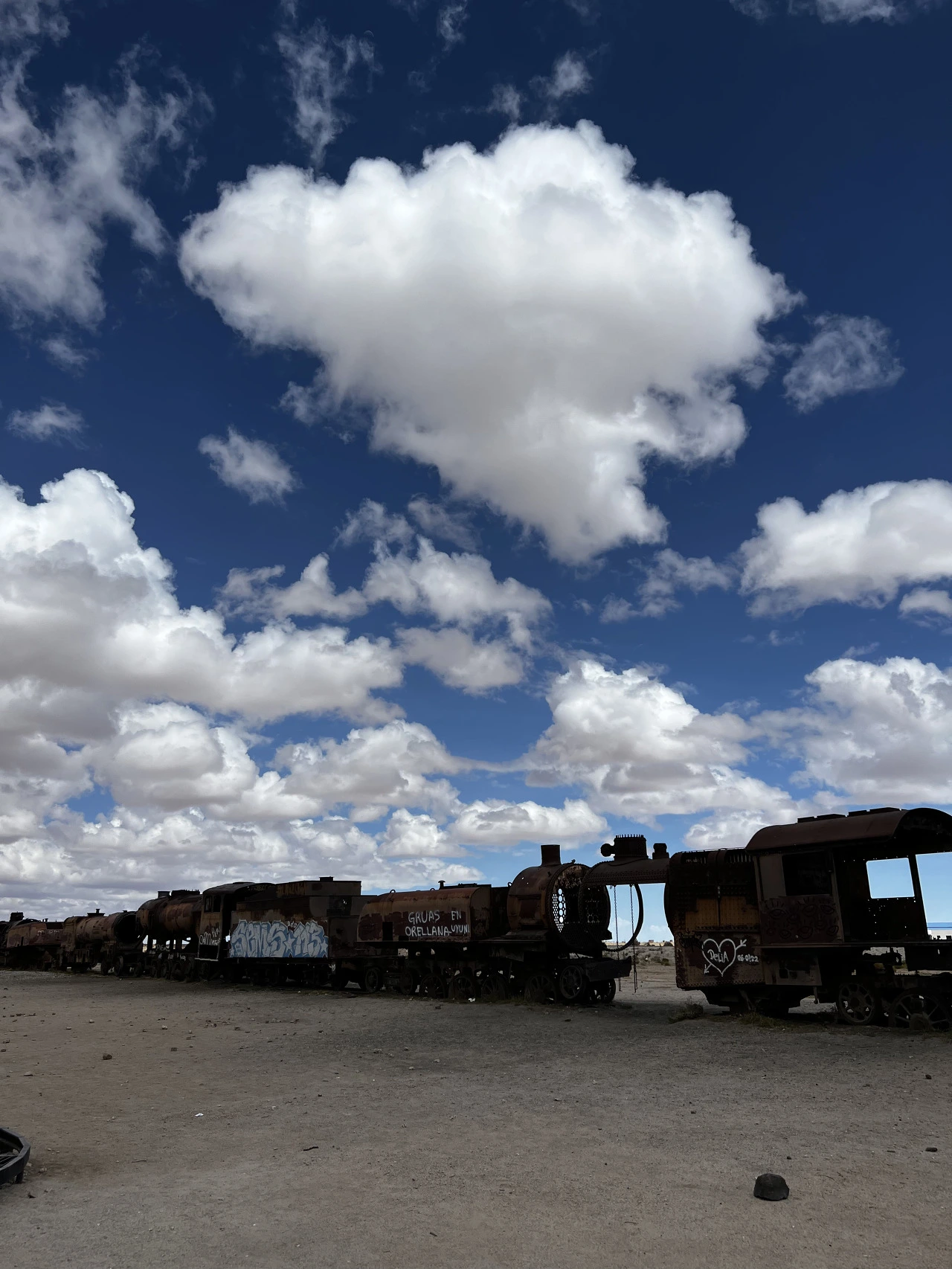 어제처럼 아리엘 투어사 앞에서 우리를 태운 차량은 오전 열 시 반에 맞춰 출발했다. 가장 먼저 방문한 곳은 기차무덤. 더 이상 이용되지 않아 망가져 고철이 된 기차가 사막 한가운데에 우두커니 서있었다. 우리는 허허벌판에 덩그러니 남겨진, 이제는 움직일 수 없는 외로운 기차들의 유일한 손님이었다. 별다른 특별함이 느껴지는 장소는 아니었지만, 내 최애 여행 유튜버 '빠니보틀'의 영상에 나온 적이 있었기에 한번쯤 가보고 싶었다.