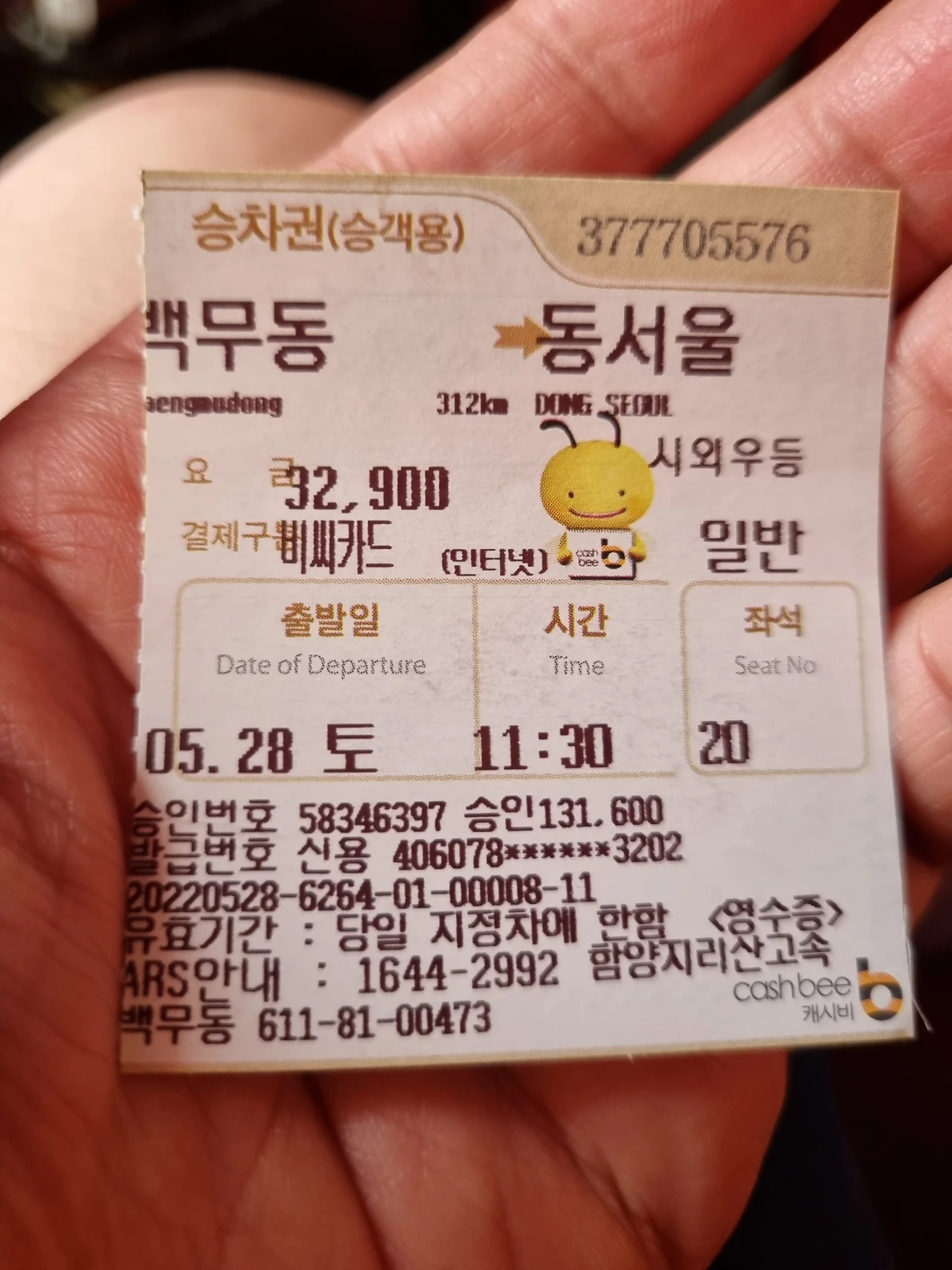 또 한참을 걸으니 백무동에 도착하였고 11시 30분에 서울행 버스에 탑승하였다.