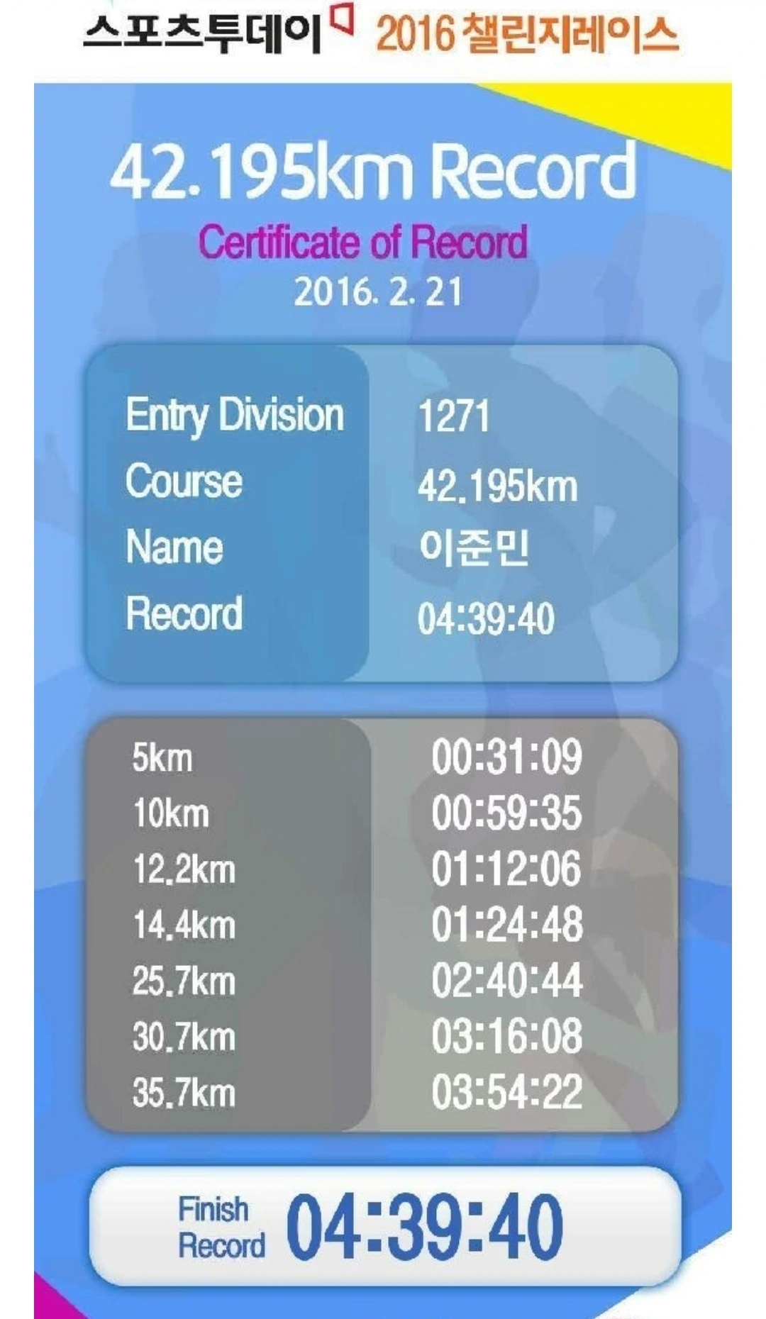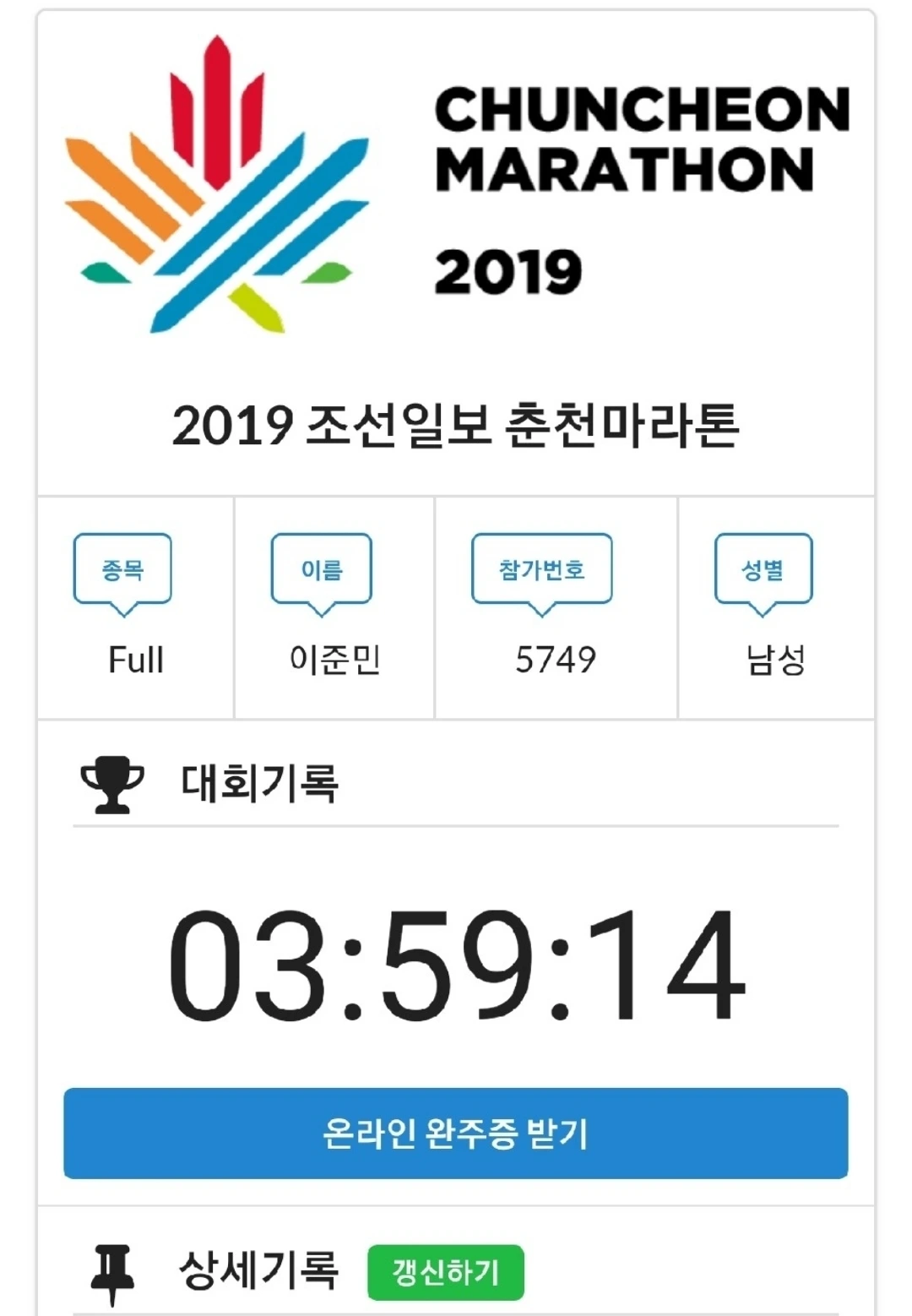 내 생에 첫번째 마라톤 기록그렇게 뛰다 보니 3년 7개월이 지나서 2019년 10월 춘천마라톤에서 겨우 SUB4를 달성하였다.