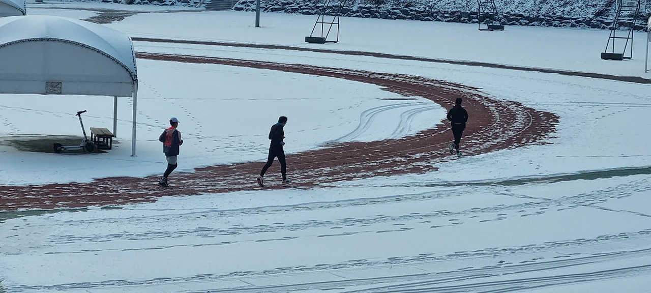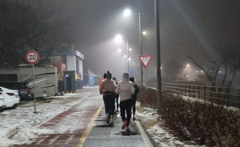 눈쌓인 반포종합운동장을 뛰는 러너들