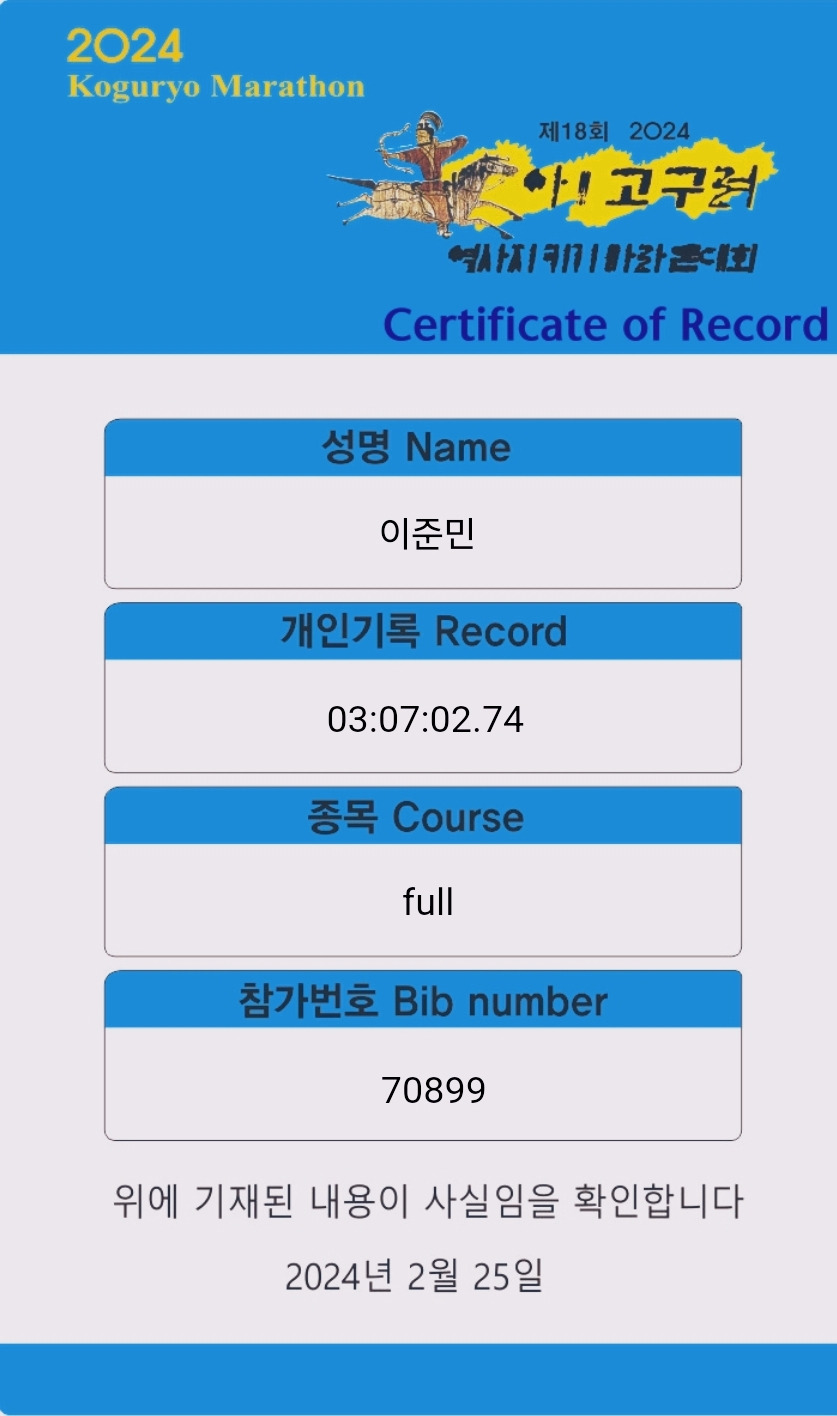 나도 이 대회 풀코스(42.195km)에 참가하였고