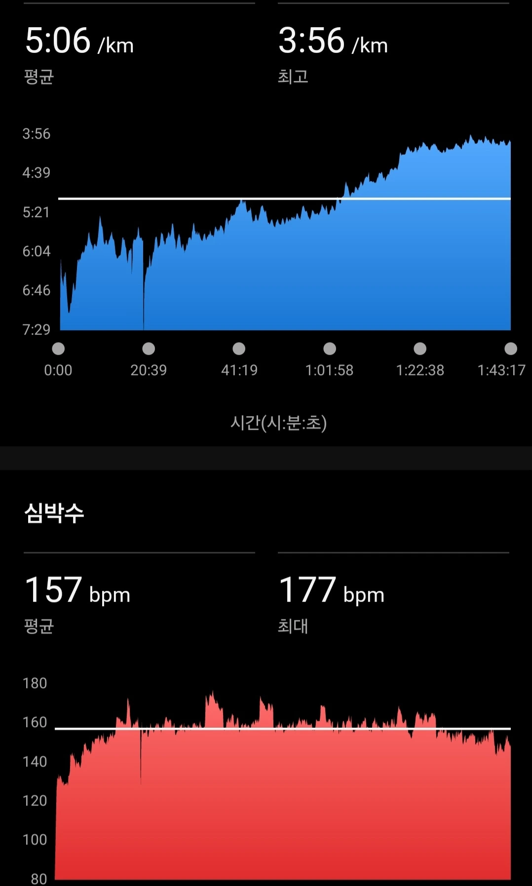 1km당 6분 페이스로 뛰는데 심박이 분당 160에 육박했다.