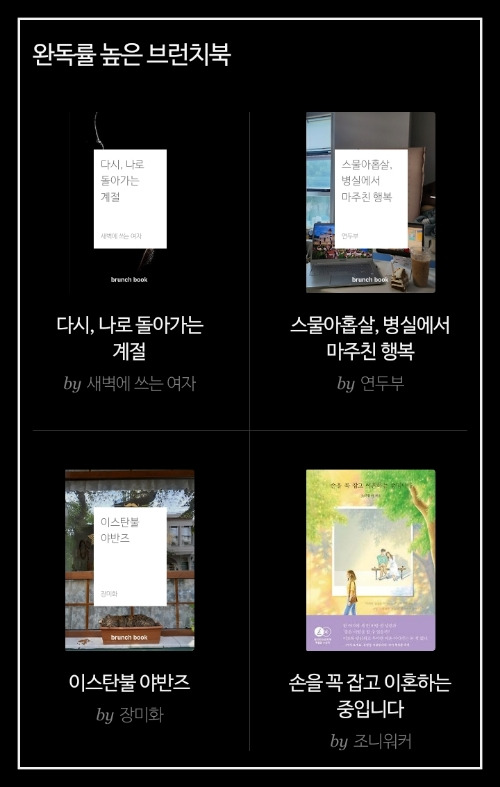 그날 이후로 일주일 동안은 틈만 나면 메인 화면을 이 잡듯이 뒤졌다. 며칠 동안 이곳에 내 브런치북이 자리 잡더니 다음번엔 완독률 높은 브런치북에 올라오기 시작했다. 이쯤 되니 자랑하고 싶은 마음에 콧구멍이 벌렁거렸다. 그래서 유치하지만 자랑하기 위해 다시 글감을 모아본다. 브런치가 주는 당근으로 나를 채찍질해보려 한다.