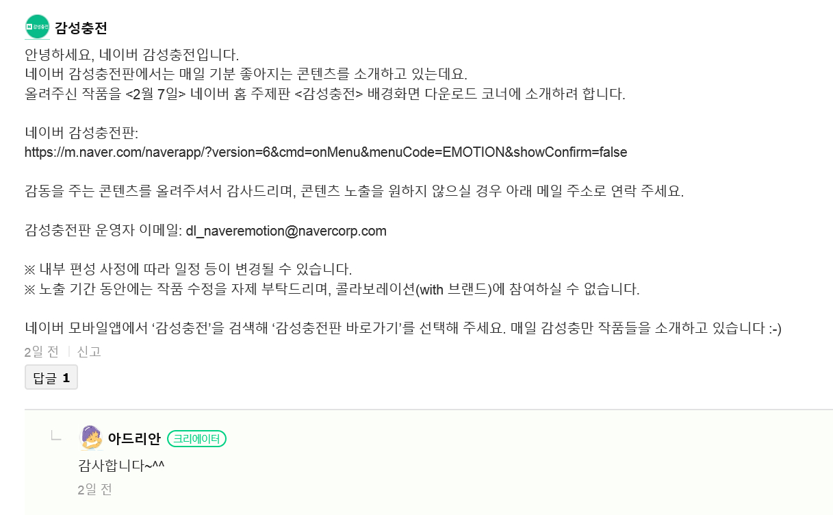 그런데 이 작품을 네이버 메인 감성충전판에 내일(2.7) 소개하겠다고 연락이 왔네요.