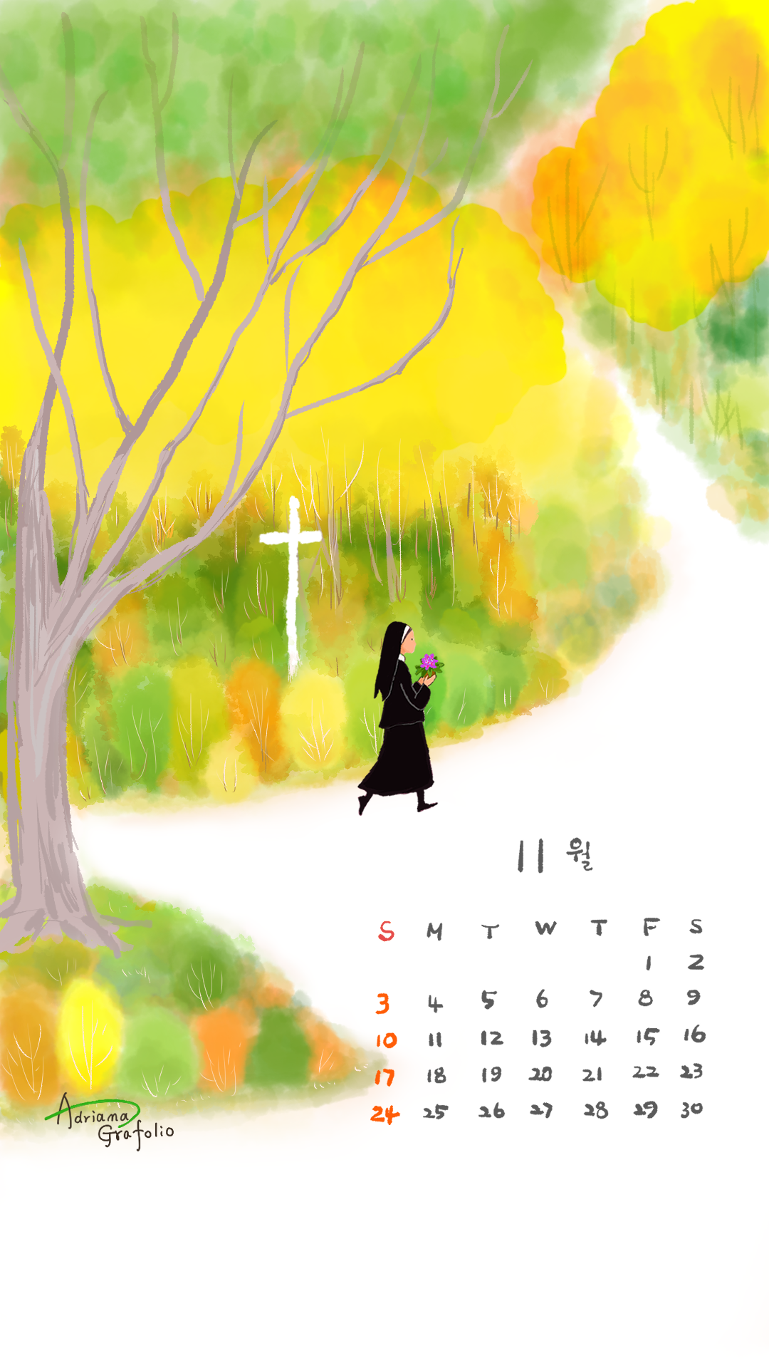 예쁜 화분을 들고 가는 수녀님과 11월 달력을 넣어서