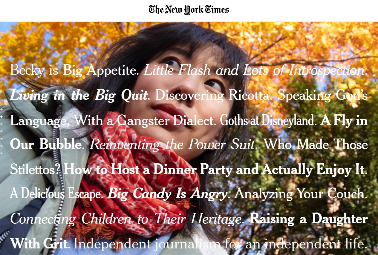 2. 영상은 유튜브에도 공개되어 있지만, NYT의 링크를 통해 보면 원래의 취지를 더욱 잘 확인할 수 있습니다. 예를 들면 베키의 영상은 (아마도 그녀가 선택했을) 15개의 NYT 기사로 구성되어 있고, 화면에서 제목을 클릭하면 해당 기사로 연결됩니다. NYT의 기사가 독자의 삶을 어떻게 다채롭게 만들어주고 있는지를 이보다 짧은 시간에 더 잘 표현할 수 있는 방법이 있을까 싶을 만큼 참신한 기획입니다.