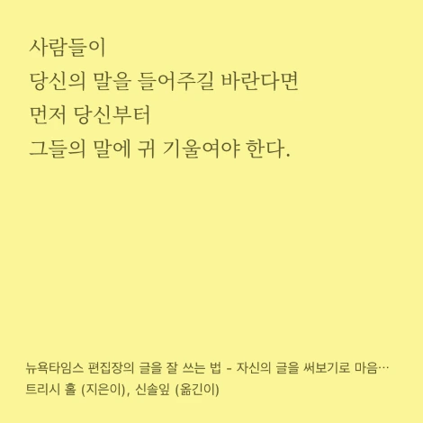 곰곰이 생각해보면 모르는 이야기는 아닙니다. 하지만 알고 있다고 쉬운 것도 아니죠. 피가 되고 살이 되는, '기본'에 관한 이야기입니다. 그대로 따르기 쉽지 않다는 것조차도 알고 있지만, 그래도 오늘은 출근해서 어제보다 좀 더 동료의 말에 귀 기울여 봐야지... 하고 생각해봅니다.